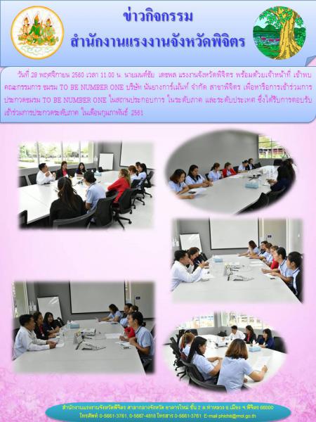 วันที่ 28 พฤศจิกายน 2560 เวลา 11.00 น. นายมนต์ชัย เดชพล แรงงานจังหวัดพิจิตร พร้อมด้วยเจ้าหน้าที่ เข้าพบคณะกรรมการ ชมรม TO BE NUMBER ONE บริษัท นันยางการ์เม้นท์ จำกัด สาขาพิจิตร เพื่อหารือการเข้าร่วมการประกวดชมรม TO BE NUMBER ONE ในสถานประกอบการ ในระดับภาค และระดับประเทศ ซึ่งได้รับการตอบรับเข้าร่วมการประกวดระดับภาค ในเดือนกุมภาพันธ์ 2561