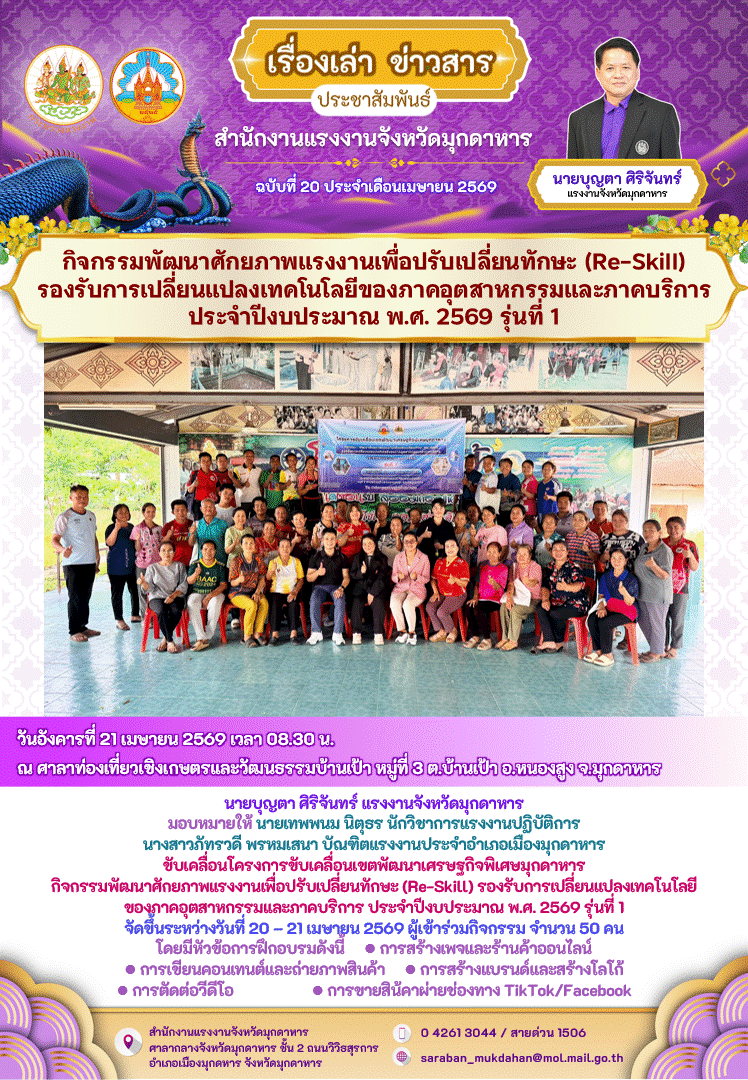 สำนักงานแรงงานจังหวัดมุกดาหาร ดำเนินกิจกรรมพัฒนาศักยภาพแรงงานเพื่อปรับเปลี่ยนทักษะ (Re-Skill) รองรับการเปลี่ยนแปลงเทคโนโลยีของภาคอุตสาหกรรมและภาคบริการ ประจำปีงบประมาณ พ.ศ. 2569 รุ่นที่ 1