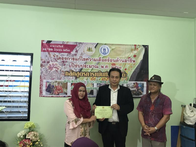 วันศุกร์ ที่ 22 มิ.ย 61 เวลา 13.30 น.นายสุทธิพงศ์ สายสาคเรศ แรงงานจังหวัดภูเก็ต ปิดโครงการแก้ไขความเดือดร้อนด้านอาชีพ หลักสูตร "การทำน้ำพริก" ณ ต.ราไวย์ อ.เมืองว จ.ภูเก็ต และ หลักสูตร "การเพ้นผ้าปาเต๊ะ" ต.ไม้ขาว อ.เมือง จ.ภูเก็ต