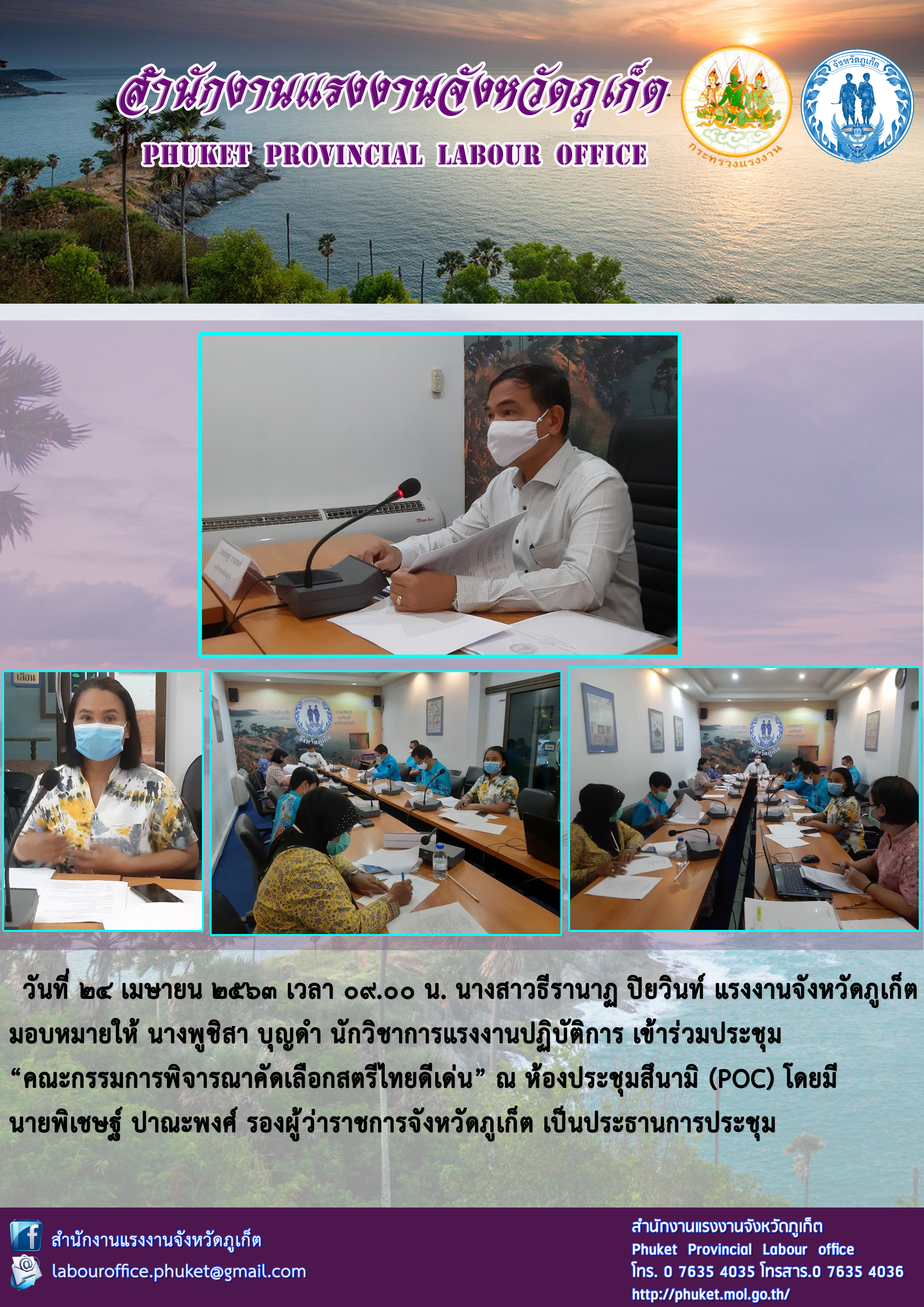 วันที่ 24 เมษายน 2563 เวลา 09.00 น. นางสาวธีรานาฏ ปิยวินท์ แรงงานจังหวัดภูเก็ต มอบหมายให้ นางพูชิสา บุญดำ นักวิชาการแรงงานปฏิบัติการ เข้าร่วมประชุม “คณะกรรมการพิจารณาคัดเลือกสตรีไทยดีเด่น” ณ ห้องประชุมสึนามิ (POC) โดยมี นายพิเชษฐ์ ปาณะพงศ์ รองผู้ว่าราชการจังหวัดภูเก็ต เป็นประธานการประชุม