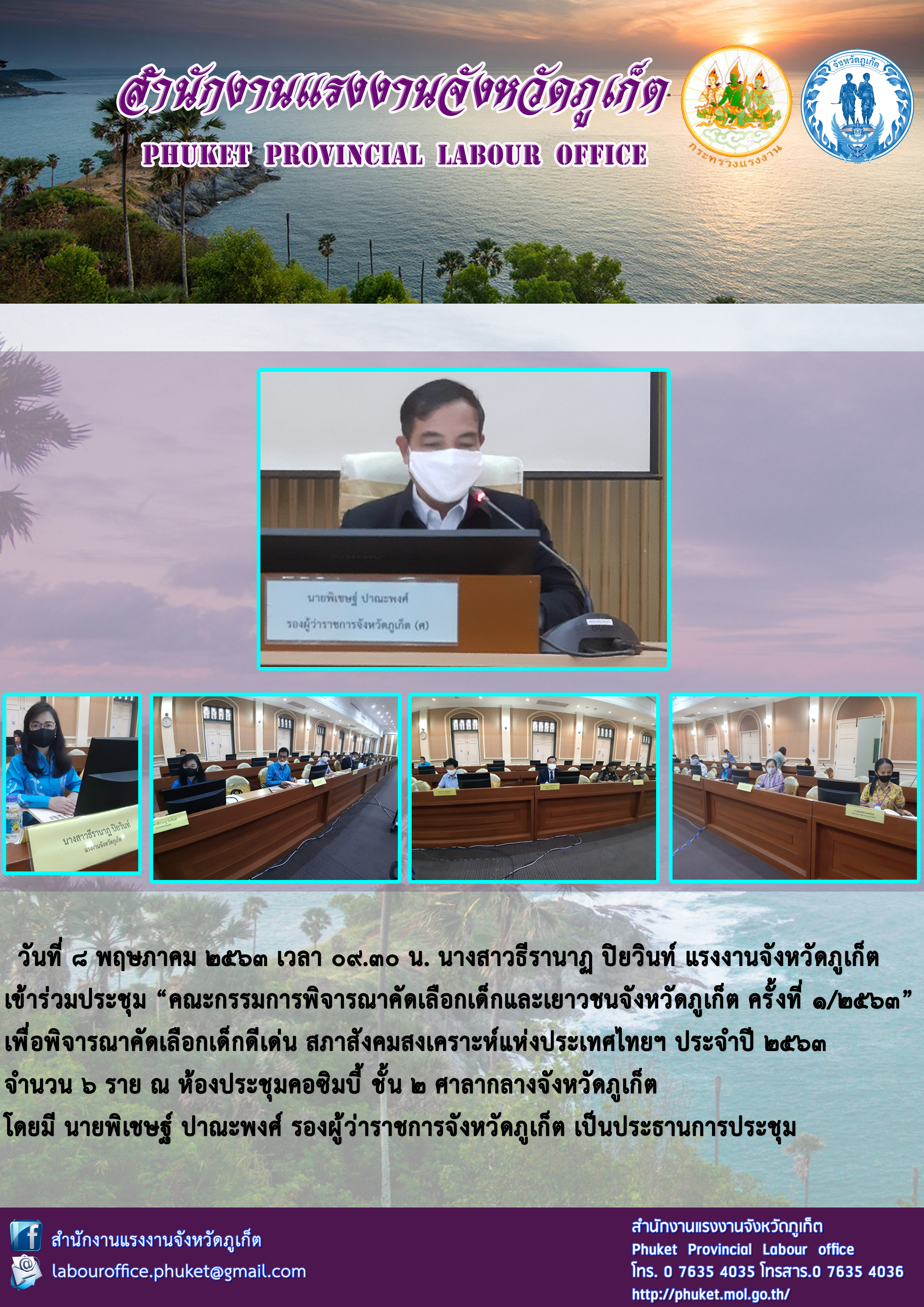 วันที่ 8 พฤษภาคม 2563 เวลา 09.30 น. นางสาวธีรานาฏ ปิยวินท์ แรงงานจังหวัดภูเก็ต เข้าร่วมประชุม “คณะกรรมการพิจารณาคัดเลือกเด็กและเยาวชนจังหวัดภูเก็ต ครั้งที่ 1/2563” เพื่อพิจารณาคัดเลือกเด็กดีเด่น สภาสังคมสงเคราะห์แห่งประเทศไทยฯ ประจำปี 2563 จำนวน 6 ราย ณ ห้องประชุมคอซิมบี้ ชั้น 2 ศาลากลางจังหวัดภูเก็ต โดยมี นายพิเชษฐ์ ปาณะพงศ์ รองผู้ว่าราชการจังหวัดภูเก็ต เป็นประธานการประชุม