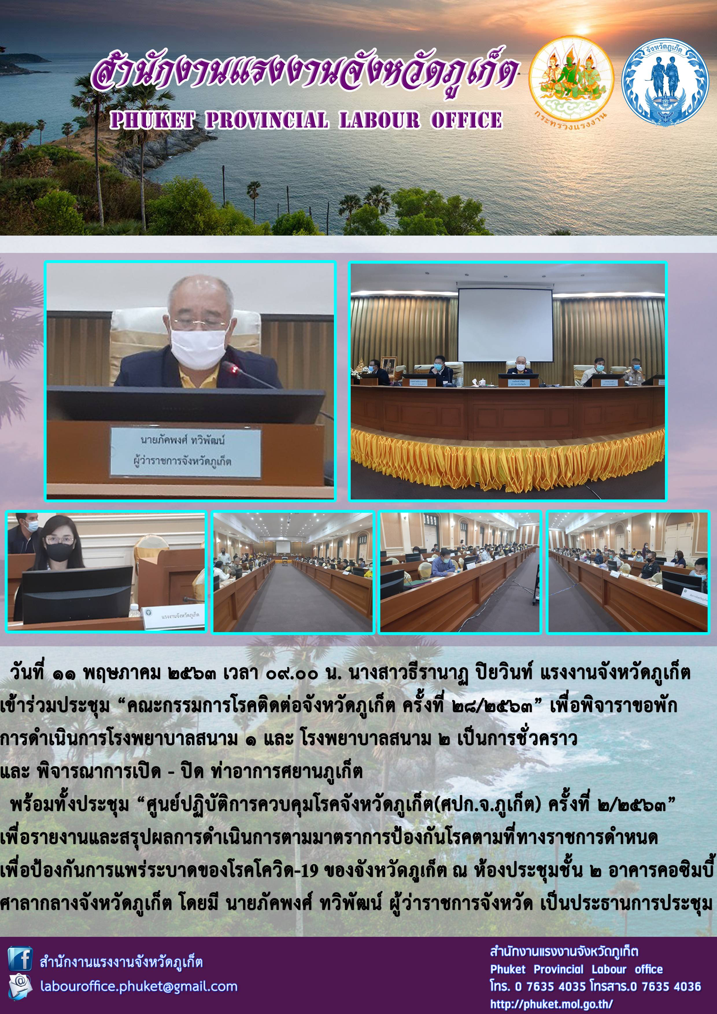 วันที่ 11 พฤษภาคม 2563 เวลา 09.00 น. นางสาวธีรานาฏ ปิยวินท์ แรงงานจังหวัดภูเก็ต เข้าร่วมประชุม “คณะกรรมการโรคติดต่อจังหวัดภูเก็ต ครั้งที่ 28/2563” เพื่อพิจาราขอพัก การดำเนินการโรงพยาบาลสนาม 1 และ โรงพยาบาลสนาม 2 เป็นการชั่วคราว และ พิจารณาการเปิด – ปิด ท่าอาการศยานภูเก็ต พร้อมทั้งประชุม “ศูนย์ปฏิบัติการควบคุมโรคจังหวัดภูเก็ต(ศปก.จ.ภูเก็ต) ครั้งที่ 2/2563” เพื่อรายงานและสรุปผลการดำเนินการตามมาตราการป้องกันโรคตามที่ทางราชการดำหนด เพื่อป้องกันการแพร่ระบาดของโรคโควิด-19 ของจังหวัดภูเก็ต ณ ห้องประชุมชั้น 2 อาคารคอซิมบี้ ศาลากลางจังหวัดภูเก็ต โดยมี นายภัคพงศ์ ทวิพัฒน์ ผู้ว่าราชการจังหวัด เป็นประธานการประชุม