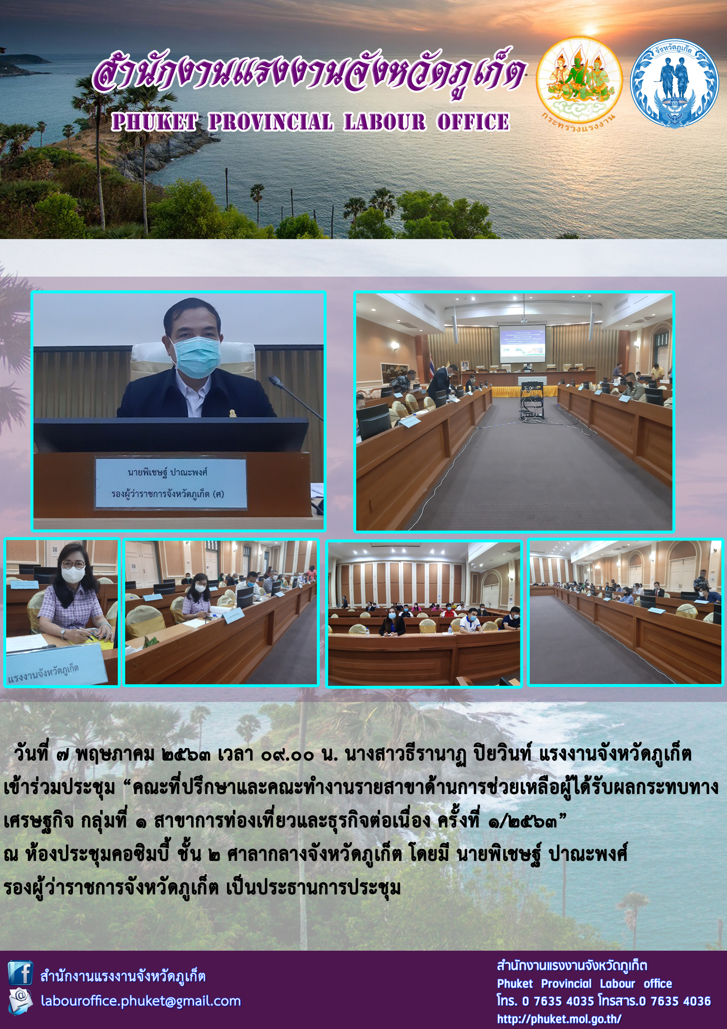 วันที่ 7 พฤษภาคม 2563 เวลา 09.00 น. นางสาวธีรานาฏ ปิยวินท์ แรงงานจังหวัดภูเก็ต เข้าร่วมประชุม “คณะที่ปรึกษาและคณะทำงานรายสาขาด้านการช่วยเหลือผู้ได้รับผลกระทบทาง เศรษฐกิจ กลุ่มที่ 1 สาขาการท่องเที่ยวและธุรกิจต่อเนื่อง ครั้งที่ 1/2563” ณ ห้องประชุมคอซิมบี้ ชั้น 2 ศาลากลางจังหวัดภูเก็ต โดยมี นายพิเชษฐ์ ปาณะพงศ์ รองผู้ว่าราชการจังหวัดภูเก็ต เป็นประธานการประชุม