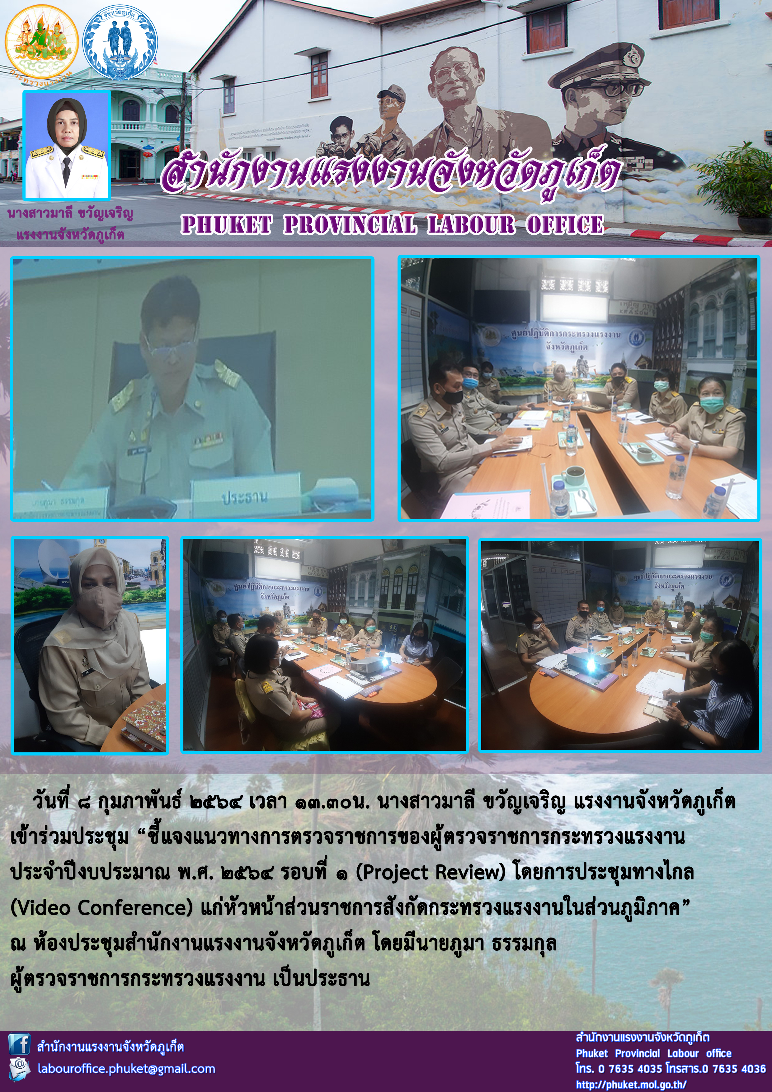 แรงงานจังหวัดภูเก็ต เข้าร่วมประชุม “ชี้แจงแนวทางการตรวจราชการของผู้ตรวจราชการกระทรวงแรงงาน ประจำปีงบประมาณ พ.ศ. 2564 รอบที่ 1 (Project Review) โดยการประชุมทางไกล (Video Conference) แก่หัวหน้าส่วนราชการสังกัดกระทรวงแรงงานในส่วนภูมิภาค”