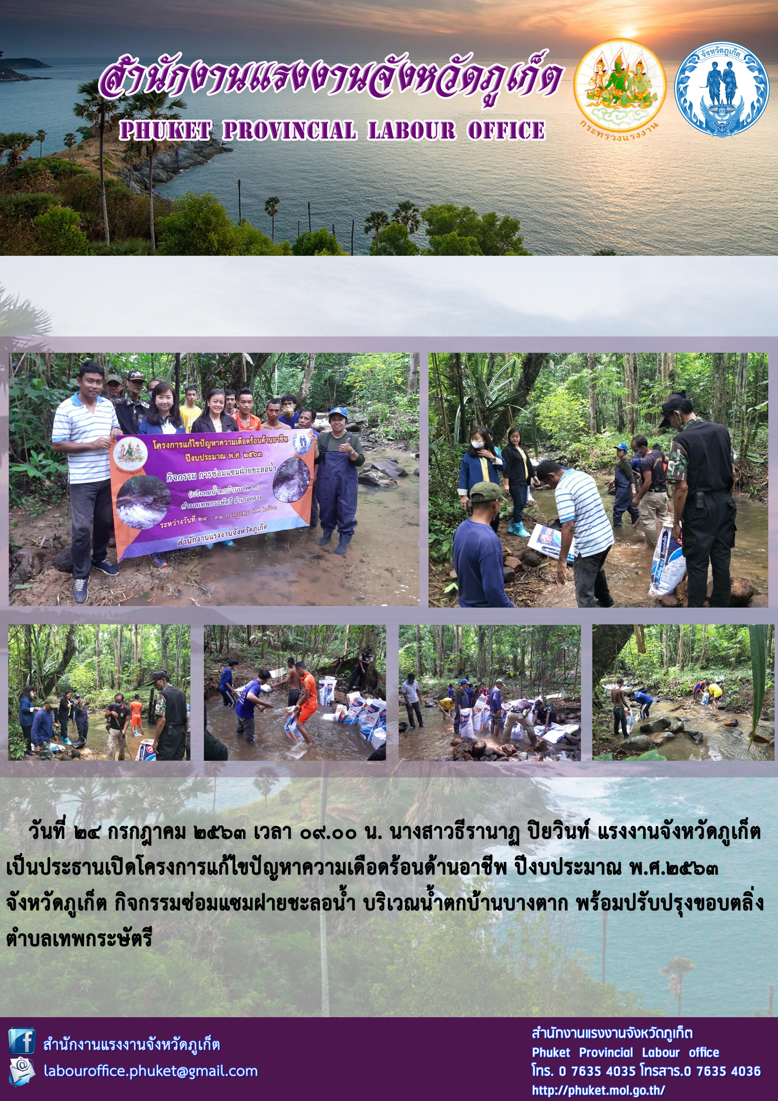 วันที่ 24 กรกฎาคม ๒๕๖๓ เวลา 09.00 น. นางสาวธีรานาฏ ปิยวินท์ แรงงานจังหวัดภูเก็ต เป็นประธานเปิดโครงการแก้ไขปัญหาความเดือดร้อนด้านอาชีพ ปีงบประมาณ พ.ศ.2563 จังหวัดภูเก็ต กิจกรรมซ่อมแซมฝายชะลอน้ำ บริเวณน้ำตกบ้านบางตาก พร้อมปรับปรุงขอบตลิ่ง ตำบลเทพกระษัตรี