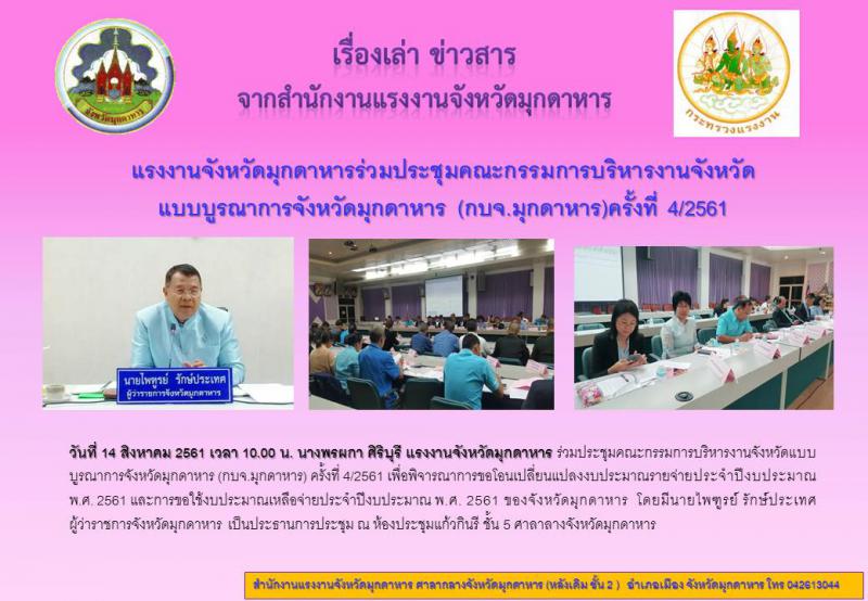 แรงงานจังหวัดมุกดาหารร่วมประชุมคณะกรรมการบริหารงานจังหวัด แบบบูรณาการจังหวัดมุกดาหาร (กบจ.มุกดาหาร)ครั้งที่ 4/2561