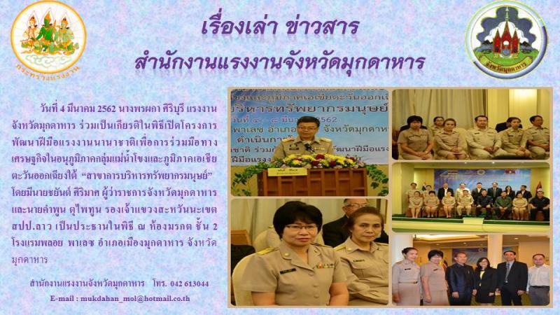 แรงงานจังหวัดมุกดาหาร ร่วมเป็นเกียรติเปิดโครงการพัฒนาฝีมือแรงงานนานาชาติเพื่อการร่วมมือทางเศรษฐกิจในอนุภูมิภาคกลุ่มแม่น้ำโขงและภูมิภาคเอเซียตัวันออกเฉียงใต้
