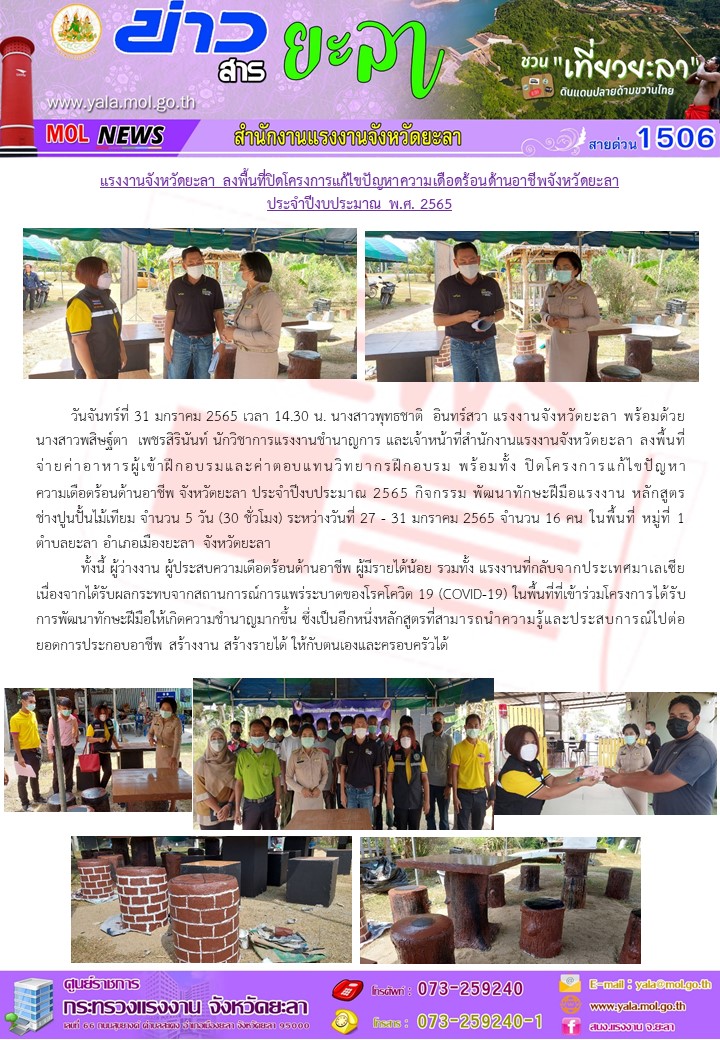 แรงงานจังหวัดยะลา ลงพื้นที่ปิดโครงการแก้ไขปัญหาความเดือดร้อนด้านอาชีพจังหวัดยะลา ประจำปีงบประมาณ พ.ศ. 2565