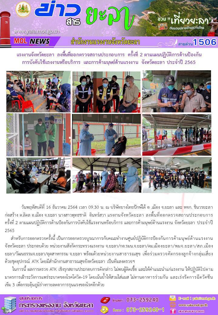 แรงงานจังหวัดยะลา ลงพื้นที่ออกตรวจสถานประกอบการ ครั้งที่ 2 ตามแผนปฏิบัติการด้านการป้องกัน การบังคับใช้แรงงานหรือบริการ และการค้ามนุษย์ด้านแรงงานจังหวัดยะลา ประจำปี 2565