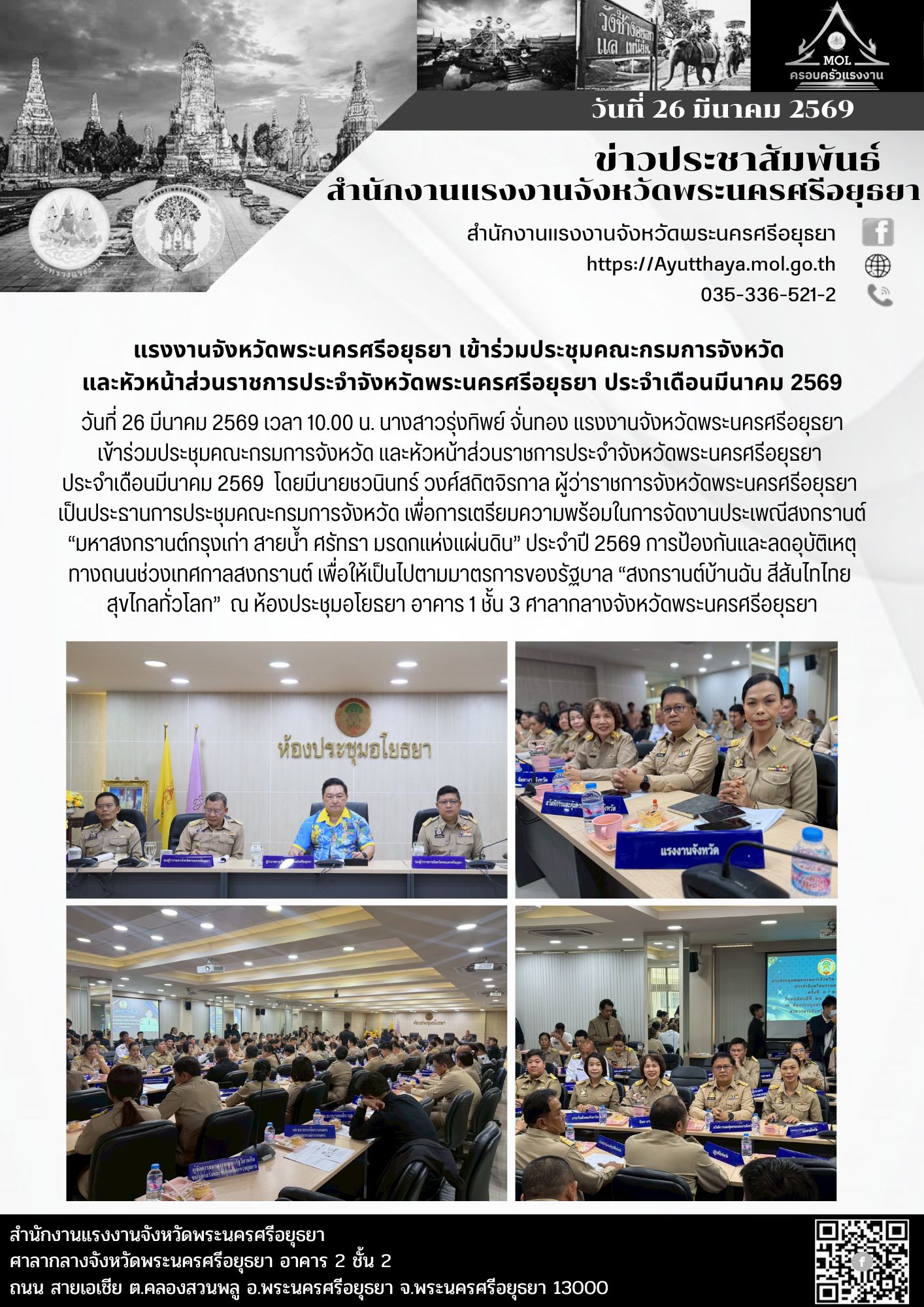 แรงงานจังหวัดพระนครศรีอยุธยา เข้าร่วมประชุมคณะกรมการจังหวัดและหัวหน้าส่วนราชการประจำจังหวัดพระนครศรีอยุธยา ประจำเดือนมีนาคม 2569