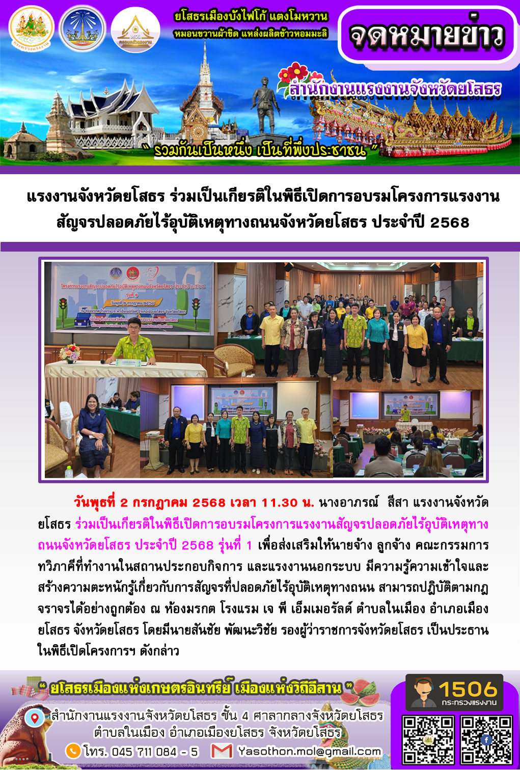 แรงงานจังหวัดยโสธร ร่วมเป็นเกียรติในพิธีเปิดการอบรมโครงการแรงงานสัญจรปลอดภัยไร้อุบัติเหตุทางถนนจังหวัดยโสธร ประจำปี 2568