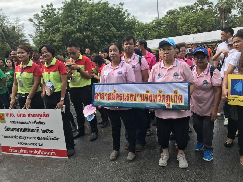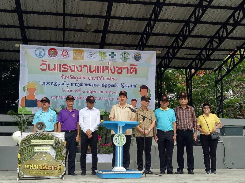 วันอังคาร ที่ 1 พฤษภาคม 2561 สำนักงานแรงงานจังหวัดภูเก็ต ร่วมงานวันแรงงานแห่งชาติ ประจำปี 2561 โดยมี นายประกอบ วงศ์มณีรุ่ง รองผุ้ว่าราชการจังหวัดภูเก็ตเป็นประธานในพิธี ภายใต้คำขวัญ "แรงงานร่วมใน เกาะภูเก็ตสะอาด ปลอดภัย ไร้มลภิษ" ณ สวนหลวง ร.9 นายสุทธิพงศ์ สายสาคเรศ แรงงานจังหวัดภูเก็ต พร้อมด้วยข้าราชการและเจ้าหน้าที่ และ ชมรมอาสาสมัครแรงงานจังหวัดภูเก็ต