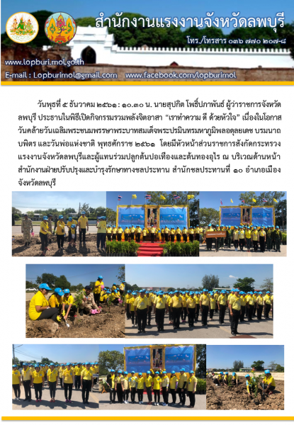 แรงงานจังหวัดลพบุรี ร่วมพิธีเปิดกิจกรรมรวมพลังจิตอาสา “เราทำความ ดี ด้วยหัวใจ” เนื่องในวันพ่อแห่งชาติ ประจำปี 2561