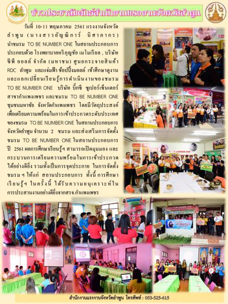 แรงงานจังหวัดลำพูน นำชมรม TO BE NUMBER ONE ในสถานประกอบการ เข้าศึกษาดูงานและแลกเปลี่ยนเรียนรู้การดำเนินงานของชมรม TO BE NUMBER ONE ณ จังหวัดกำแพงเพชร