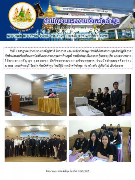 แรงงานจังหวัดลำพูน ร่วมพิธีเปิดการประชุมเชิงปฏิบัติการจัดทำแผนและขับเคลื่อนการป้องกันและปราบปรามการค้ามนุษย์ การค้าประเวณีและการคุ้มครองเด็ก