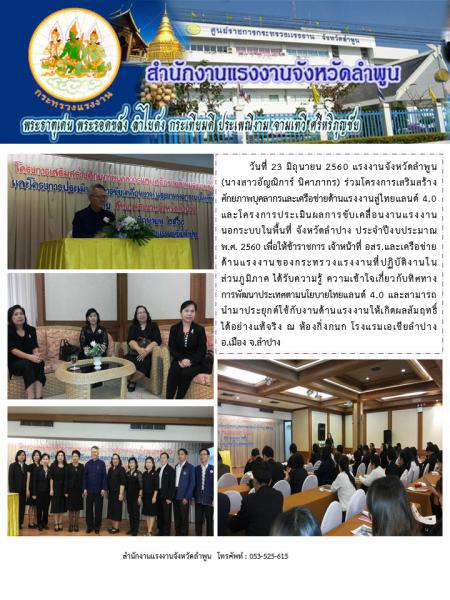 แรงงานจังหวัดลำพูน ร่วมโครงการเสริมสร้างศักยภาพบุคลากรและเครือข่ายด้านแรงงานสู่ไทยแลนด์ 4.0 และโครงการประเมินผลการขับเคลื่อนงานแรงงานนอกระบบในพื้นที่ จังหวัดลำปาง ประจำปีงบประมาณ พ.ศ. 2560