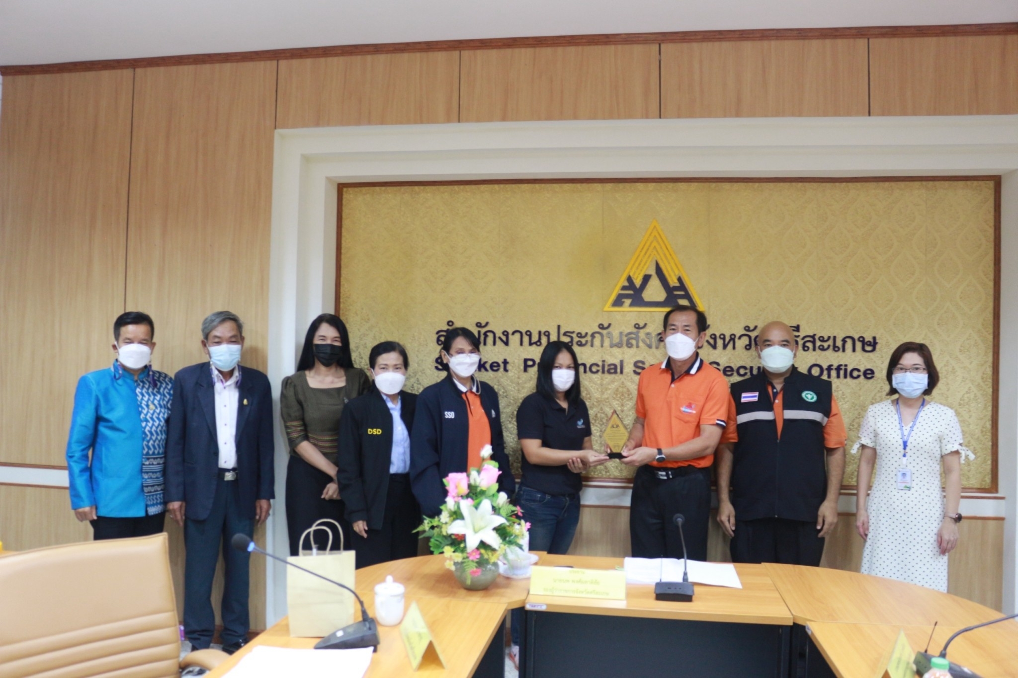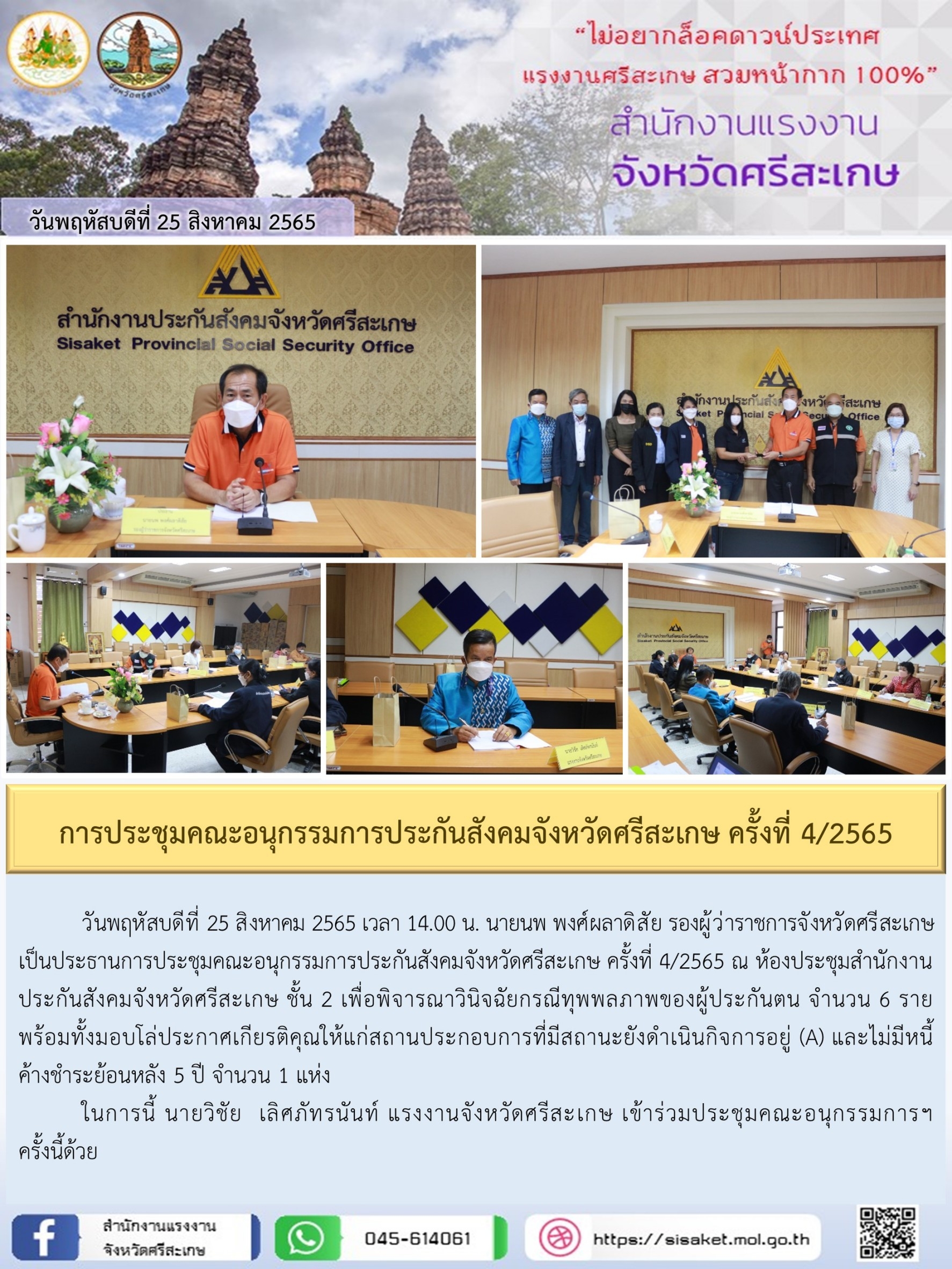 วันพฤหัสบดีที่ 25 สิงหาคม 2565 เวลา 14.00 น. นายนพ พงศ์ผลาดิสัย รองผู้ว่าราชการจังหวัดศรีสะเกษ เป็นประธานการประชุมคณะอนุกรรมการประกันสังคมจังหวัดศรีสะเกษ ครั้งที่ 4/2565 ณ ห้องประชุมสำนักงานประกันสังคมจังหวัดศรีสะเกษ ชั้น 2 เพื่อพิจารณาวินิจฉัยกรณีทุพพลภาพของผู้ประกันตน จำนวน 6 ราย พร้อมทั้งมอบโล่ประกาศเกียรติคุณให้แก่สถานประกอบการที่มีสถานะยังดำเนินกิจการอยู่ (A) และไม่มีหนี้ ค้างชำระย้อนหลัง 5 ปี จำนวน 1 แห่ง