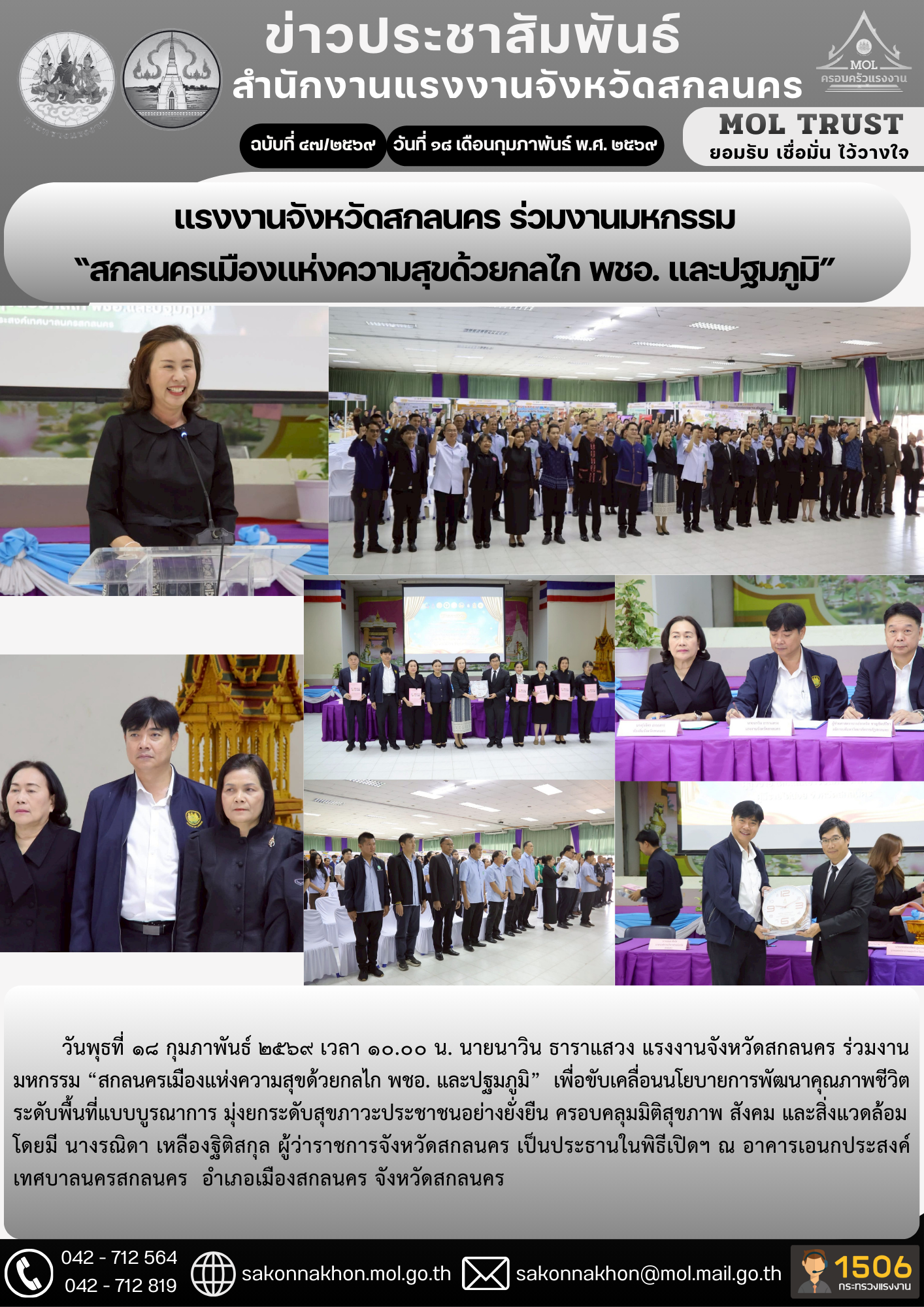 แรงงานจังหวัดสกลนคร ร่วมงานมหกรรม “สกลนครเมืองแห่งความสุขด้วยกลไก พชอ. และปฐมภูมิ”