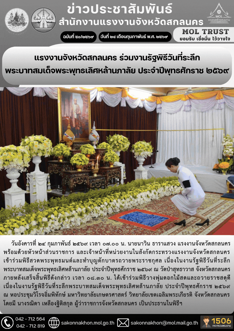 แรงงานจังหวัดสกลนคร ร่วมงานรัฐพิธีวันที่ระลึก พระบาทสมเด็จพระพุทธเลิศหล้านภาลัย ประจำปีพุทธศักราช 2569