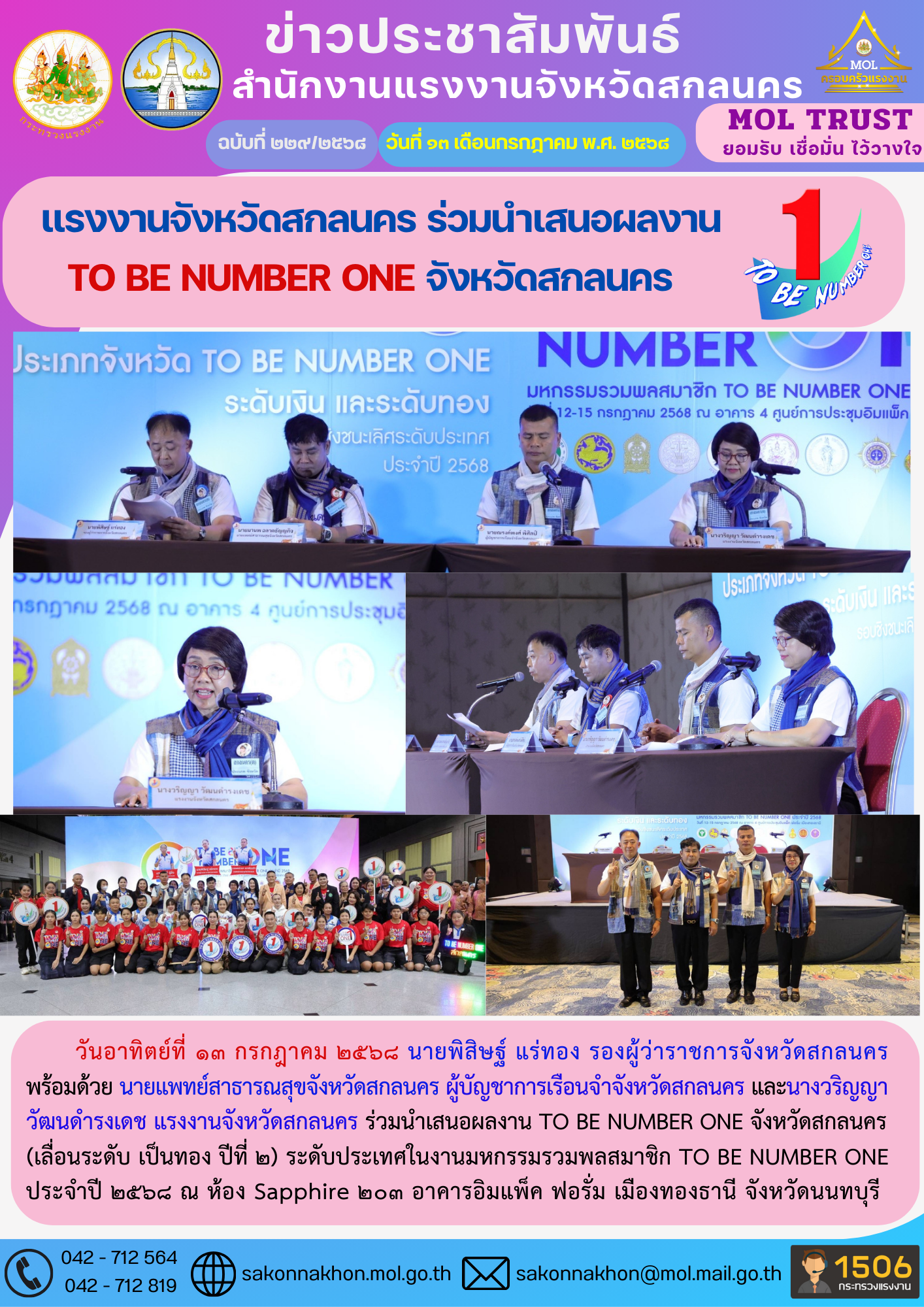 แรงงานจังหวัดสกลนคร ร่วมนำเสนอผลงาน TO BE NUMBER ONE จังหวัดสกลนคร
