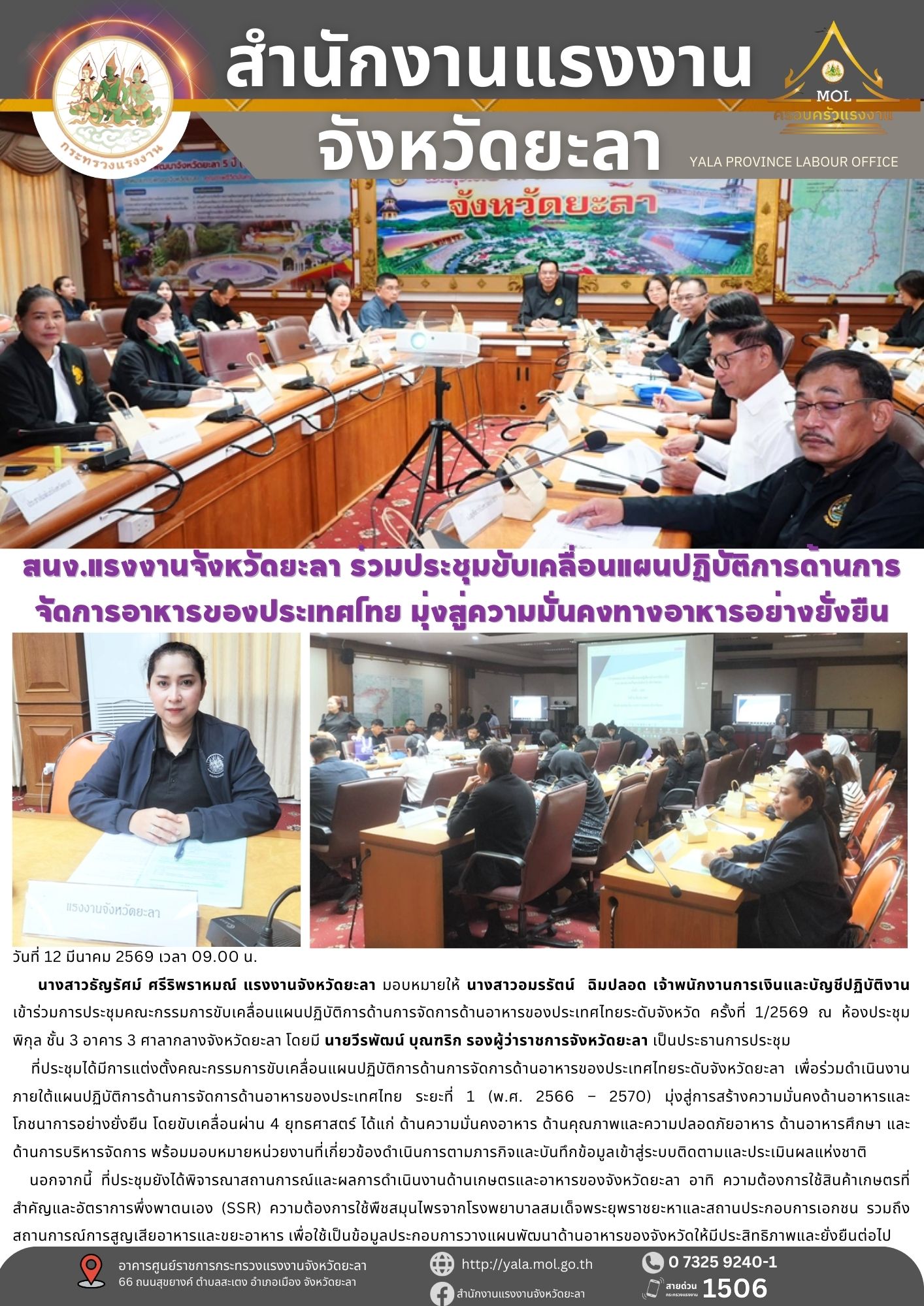 สนง.แรงงานจังหวัดยะลา ร่วมประชุมขับเคลื่อนแผนปฏิบัติการด้านการจัดการอาหารของประเทศไทย มุ่งสู่ความมั่นคงทางอาหารอย่างยั่งยืน