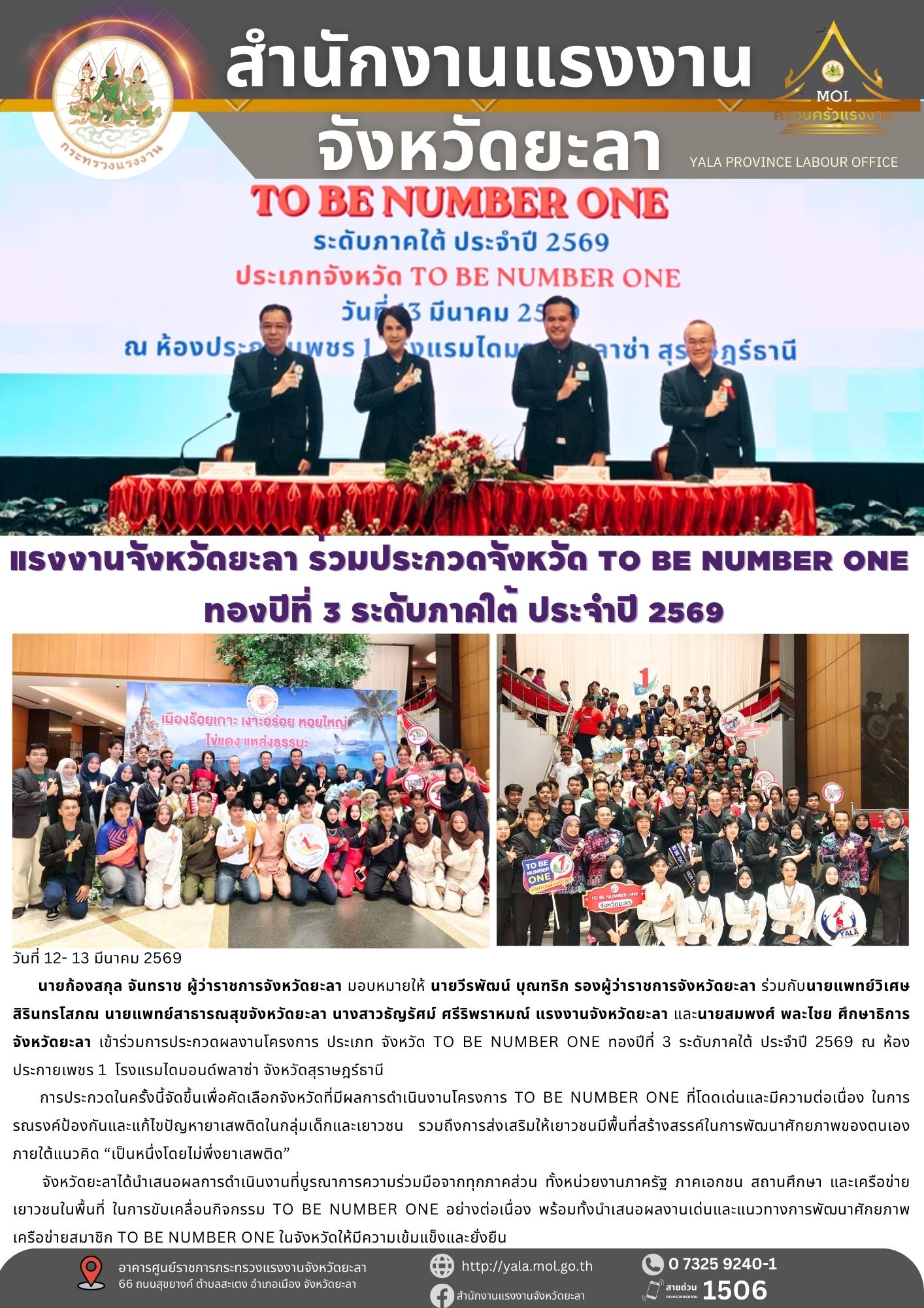แรงงานจังหวัดยะลา ร่วมประกวดจังหวัด TO BE NUMBER ONE ทองปีที่ 3 ระดับภาคใต้ ประจำปี 2569