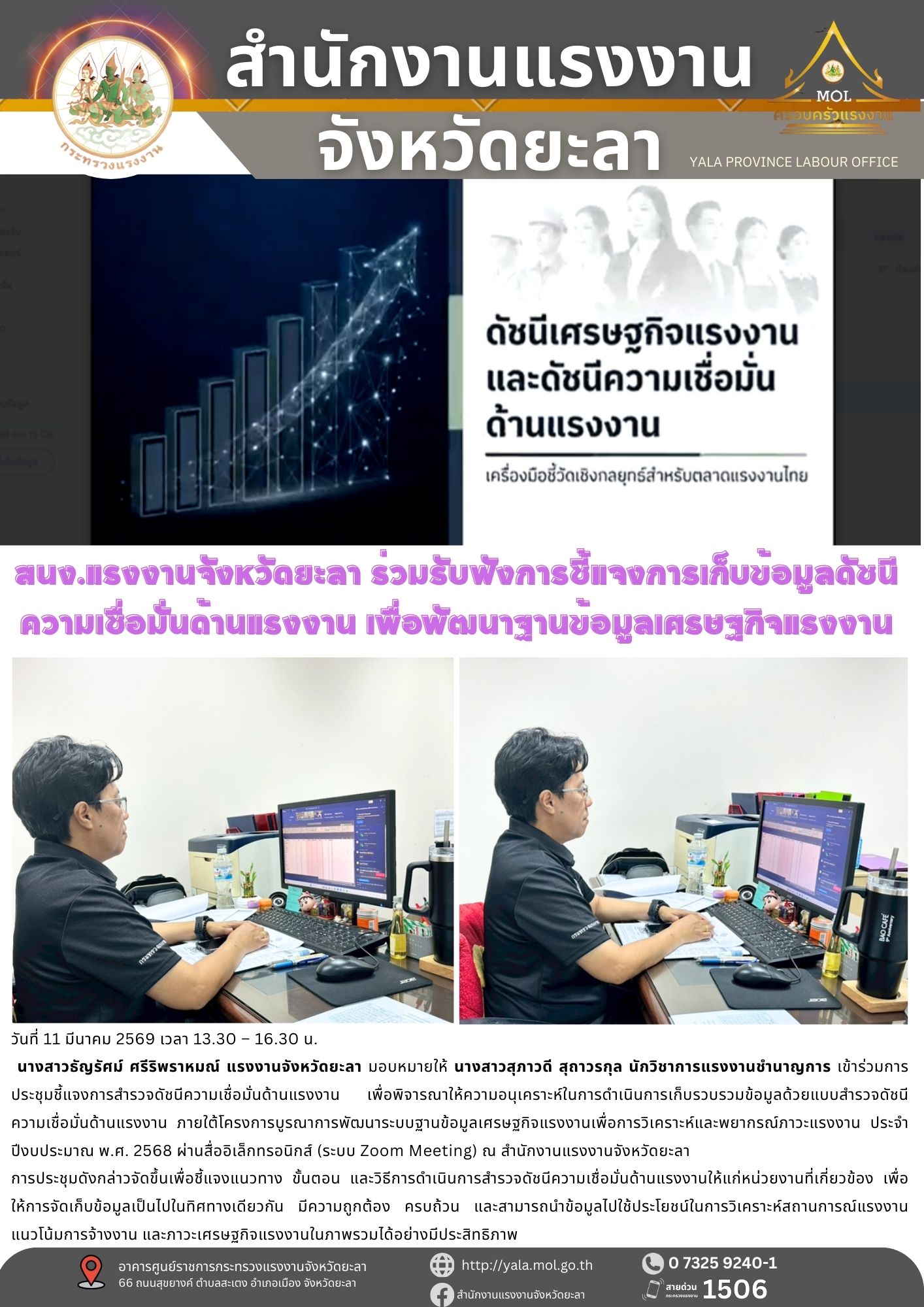 สนง.แรงงานจังหวัดยะลา ร่วมรับฟังการชี้แจงการเก็บข้อมูลดัชนีความเชื่อมั่นด้านแรงงาน เพื่อพัฒนาฐานข้อมูลเศรษฐกิจแรงงาน
