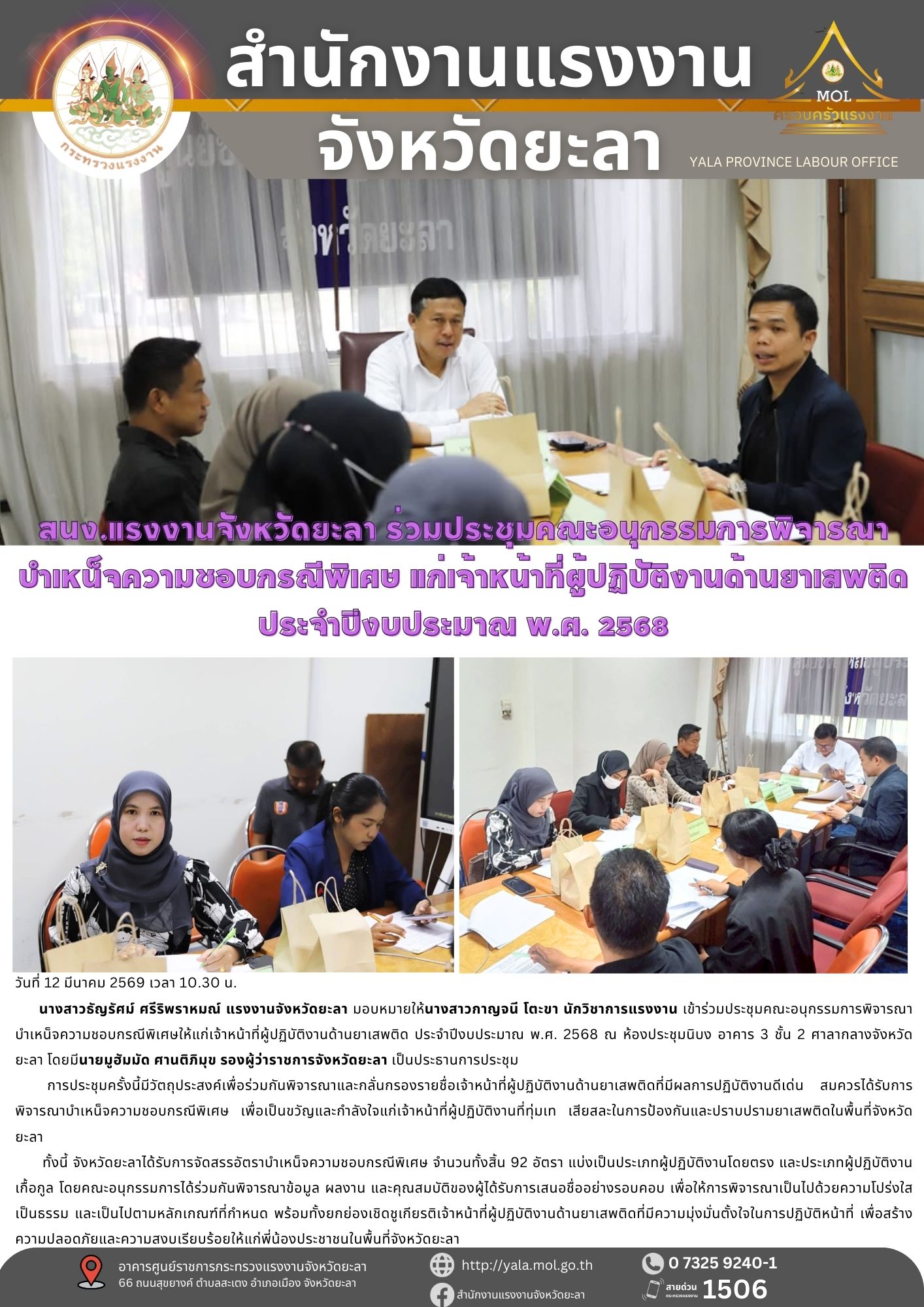 สนง.แรงงานจังหวัดยะลา ร่วมประชุมคณะอนุกรรมการพิจารณา บำเหน็จความชอบกรณีพิเศษ แก่เจ้าหน้าที่ผู้ปฏิบัติงานด้านยาเสพติด ประจำปีงบประมาณ พ.ศ. 2568