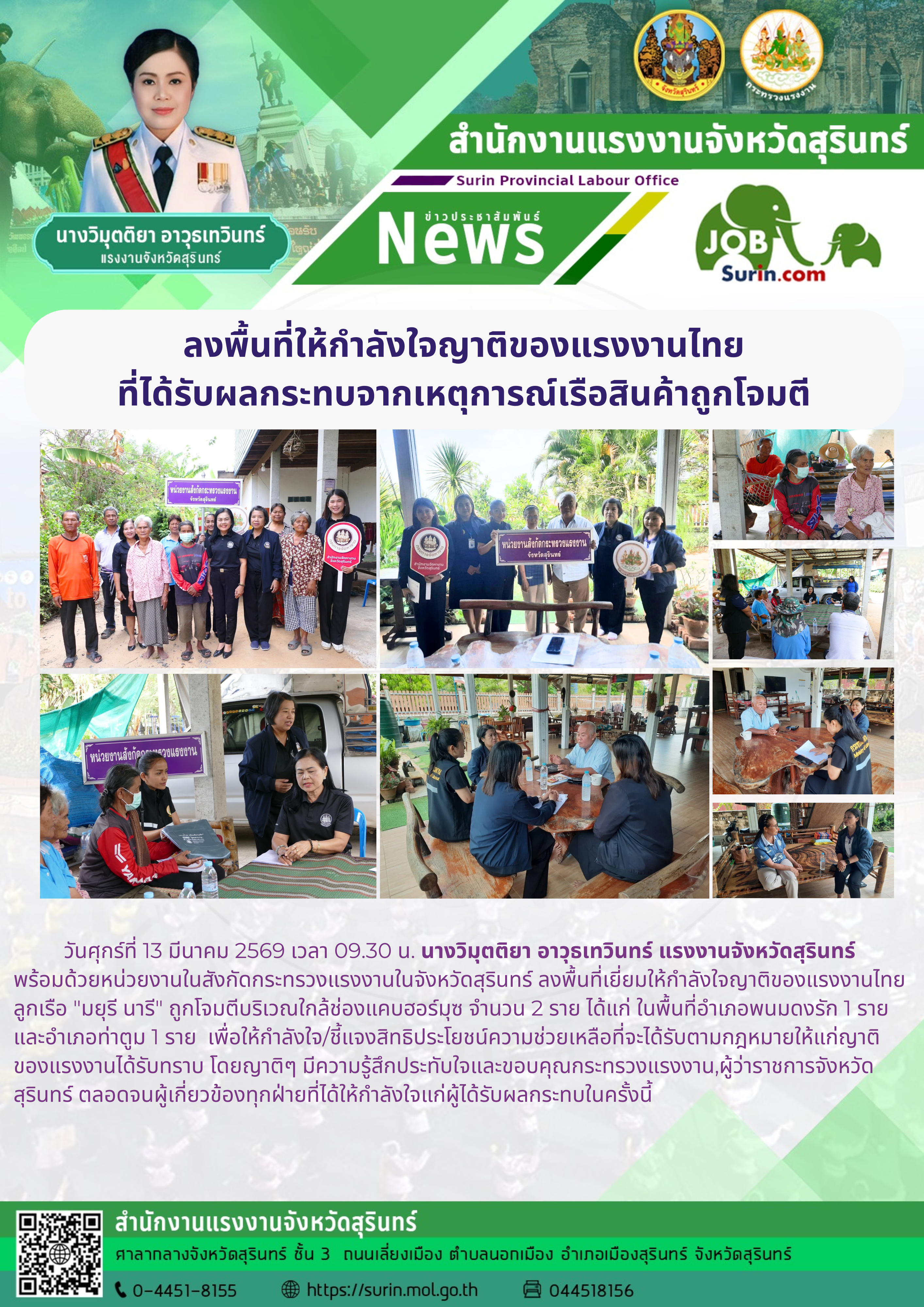 แรงงานจังหวัดสุรินทร์ ลงพื้นที่ให้กำลังใจญาติของแรงงานไทย ที่ได้รับผลกระทบจากเหตุการณ์เรือสินค้าถูกโจมตี