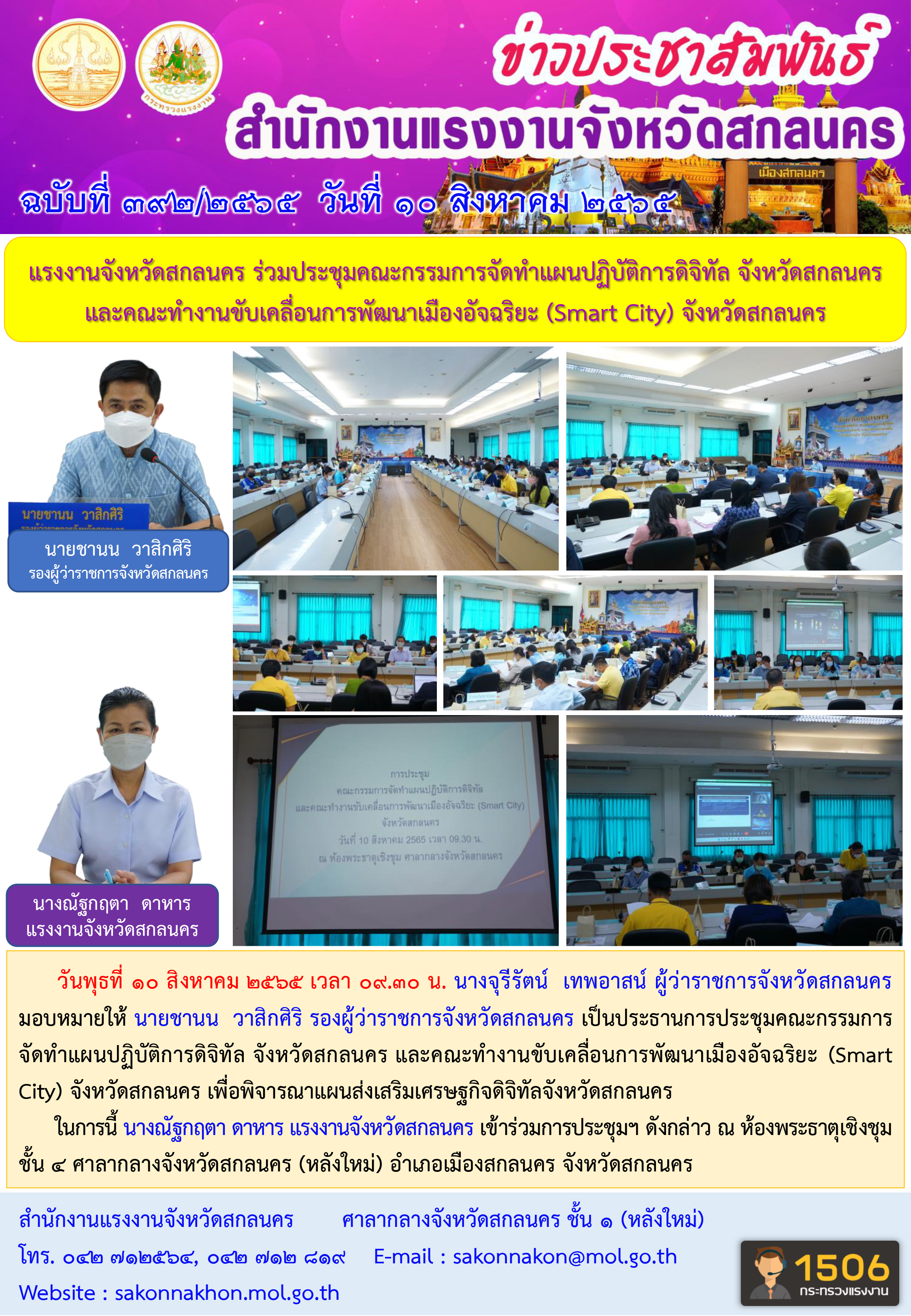 แรงงานจังหวัดสกลนคร ร่วมประชุมคณะกรรมการจัดทำแผนปฏิบัติการดิจิทัล จังหวัดสกลนคร และคณะทำงานขับเคลื่อนการพัฒนาเมืองอัจฉริยะ (Smart City) จังหวัดสกลนคร