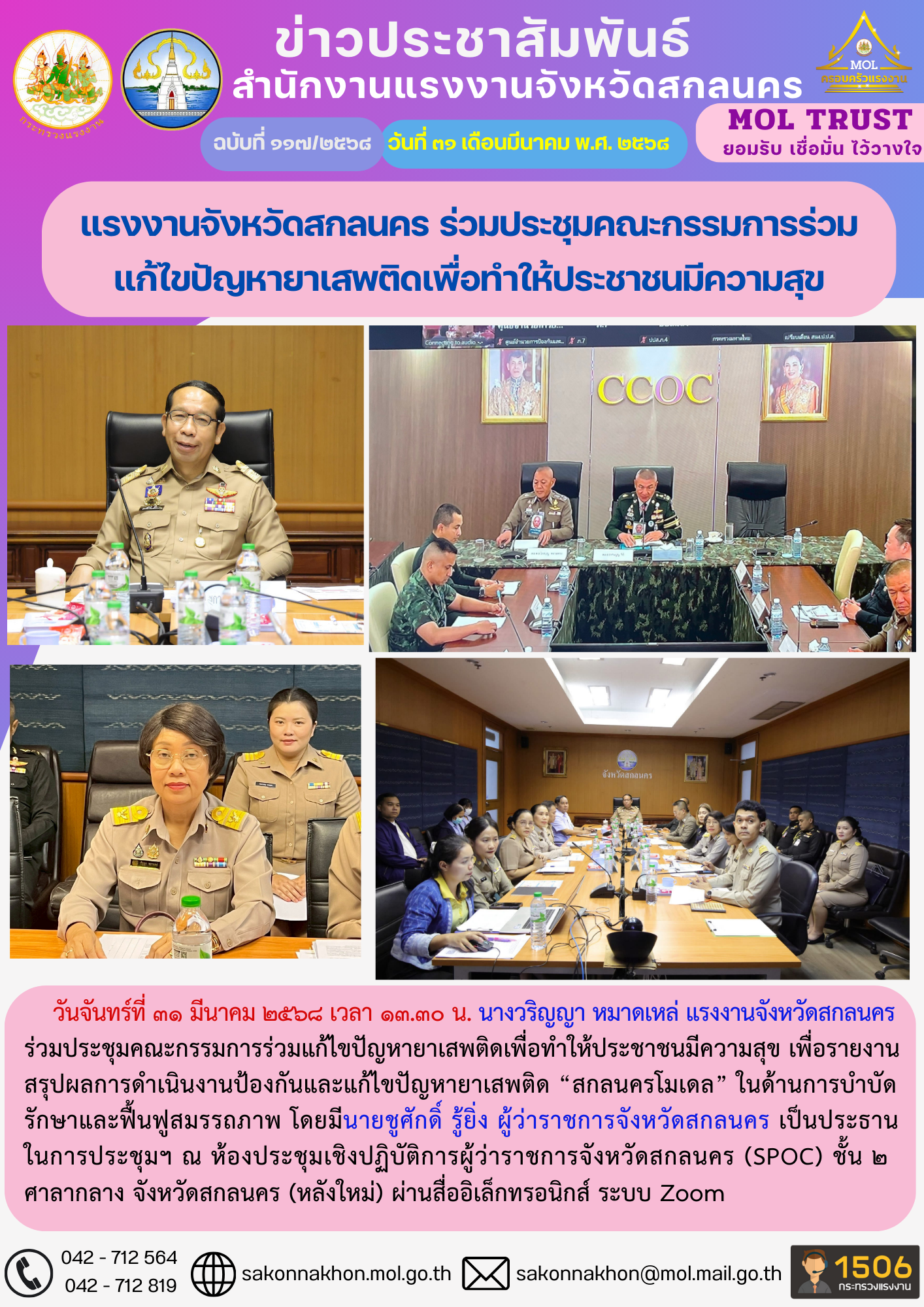 แรงงานจังหวัดสกลนคร ร่วมประชุมคณะกรรมการร่วม แก้ไขปัญหายาเสพติดเพื่อทำให้ประชาชนมีความสุข