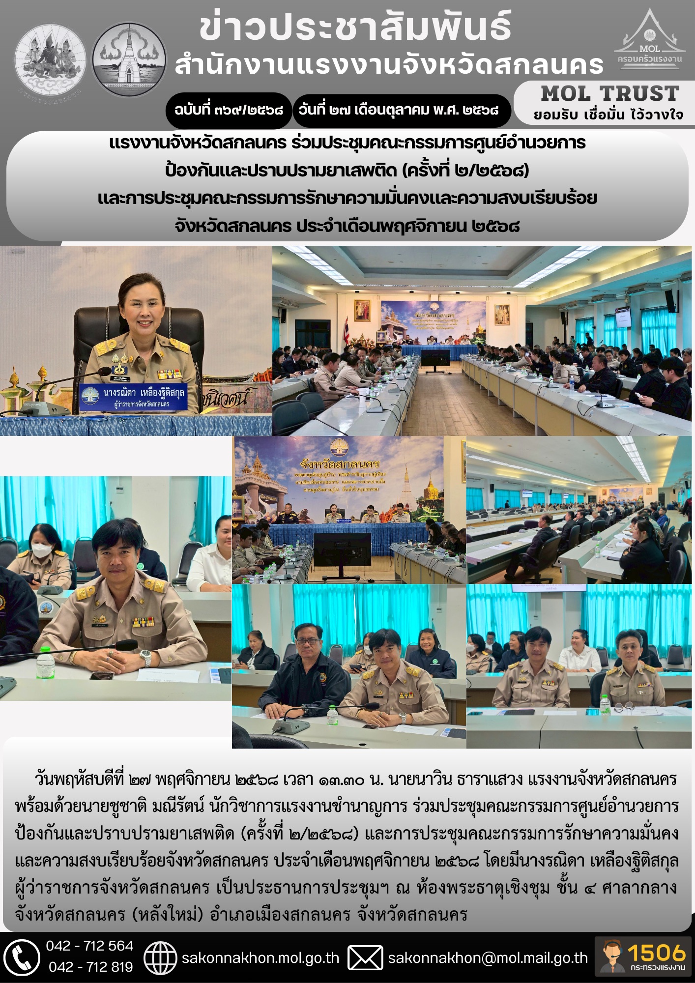 แรงงานจังหวัดสกลนคร ร่วมประชุมคณะกรรมการศูนย์อำนวยการ ป้องกันและปราบปรามยาเสพติด (ครั้งที่ 2/2568) และการประชุมคณะกรรมการรักษาความมั่นคงและความสงบเรียบร้อยจังหวัดสกลนคร ประจำเดือนพฤศจิกายน 2568