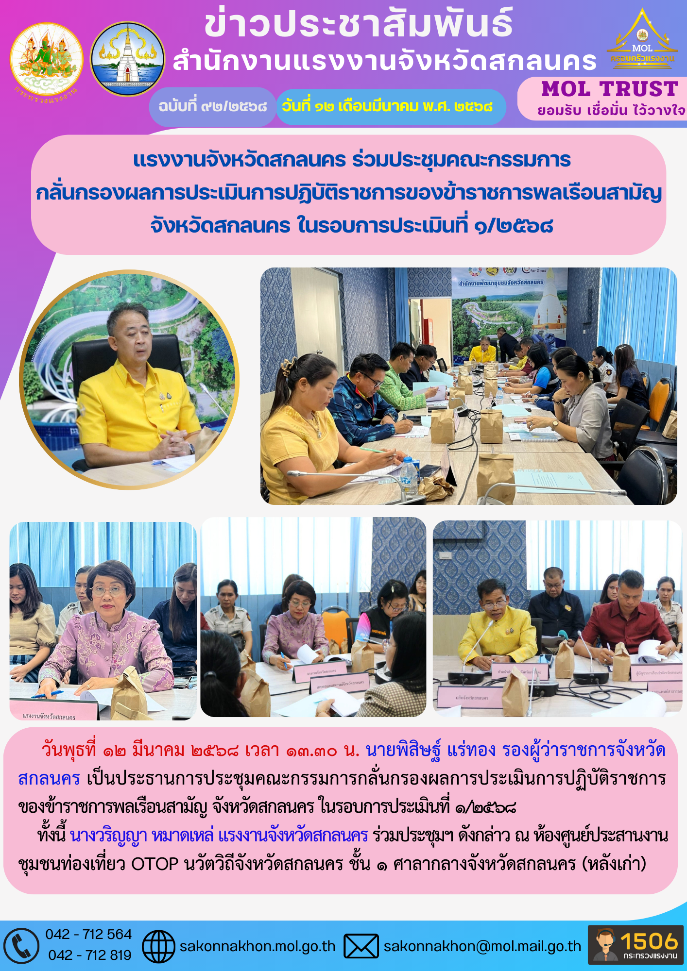 แรงงานจังหวัดสกลนคร ร่วมประชุมคณะกรรมการ กลั่นกรองผลการประเมินการปฏิบัติราชการของข้าราชการพลเรือนสามัญ จังหวัดสกลนคร ในรอบการประเมินที่ 1/2568