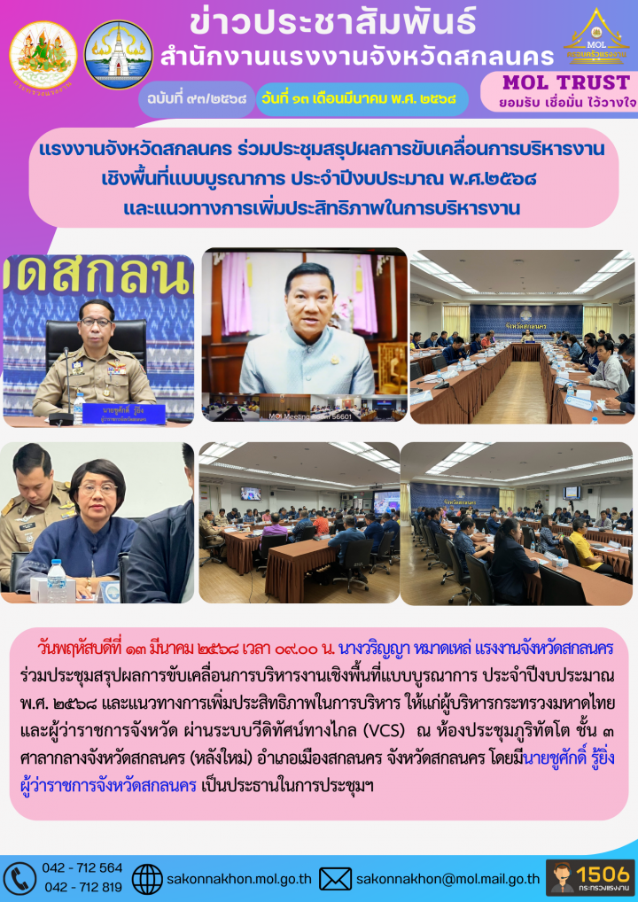 แรงงานจังหวัดสกลนคร ร่วมประชุมสรุปผลการขับเคลื่อนการบริหารงาน เชิงพื้นที่แบบบูรณาการ ประจำปีงบประมาณ พ.ศ.2568 และแนวทางการเพิ่มประสิทธิภาพในการบริหารงาน