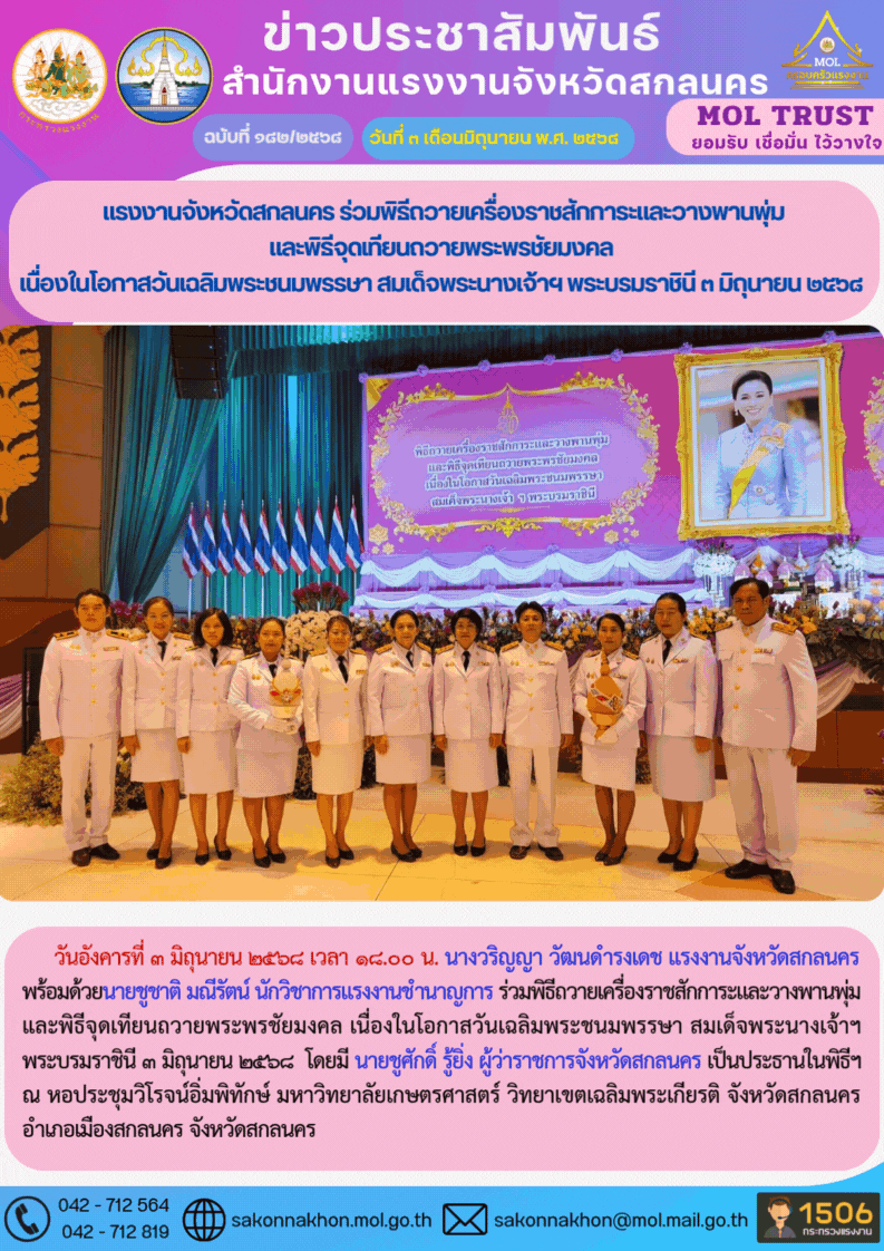 แรงงานจังหวัดสกลนคร ร่วมพิธีถวายเครื่องราชสักการะและวางพานพุ่ม และพิธีจุดเทียนถวายพระพรชัยมงคล เนื่องในโอกาสวันเฉลิมพระชนมพรรษา สมเด็จพระนางเจ้าฯ พระบรมราชินี 3 มิถุนายน 2568