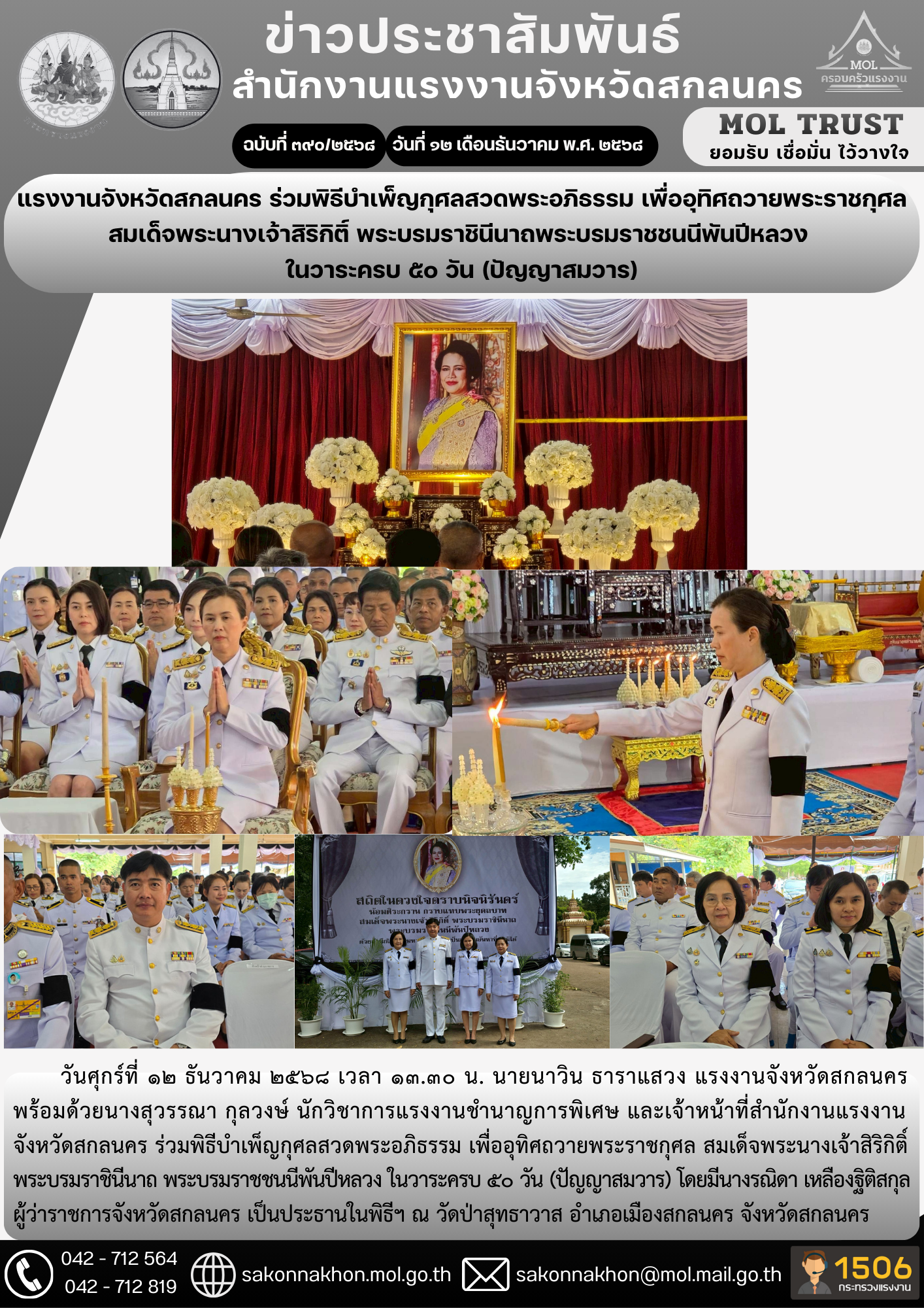 แรงงานจังหวัดสกลนคร ร่วมพิธีบำเพ็ญกุศลสวดพระอภิธรรมเพื่ออุทิศถวายพระราชกุศล สมเด็จพระนางเจ้าสิริกิติ์ พระบรมราชินีนาถพระบรมราชชนนีพันปีหลวง ในวาระครบ 50 วัน (ปัญญาสมวาร)