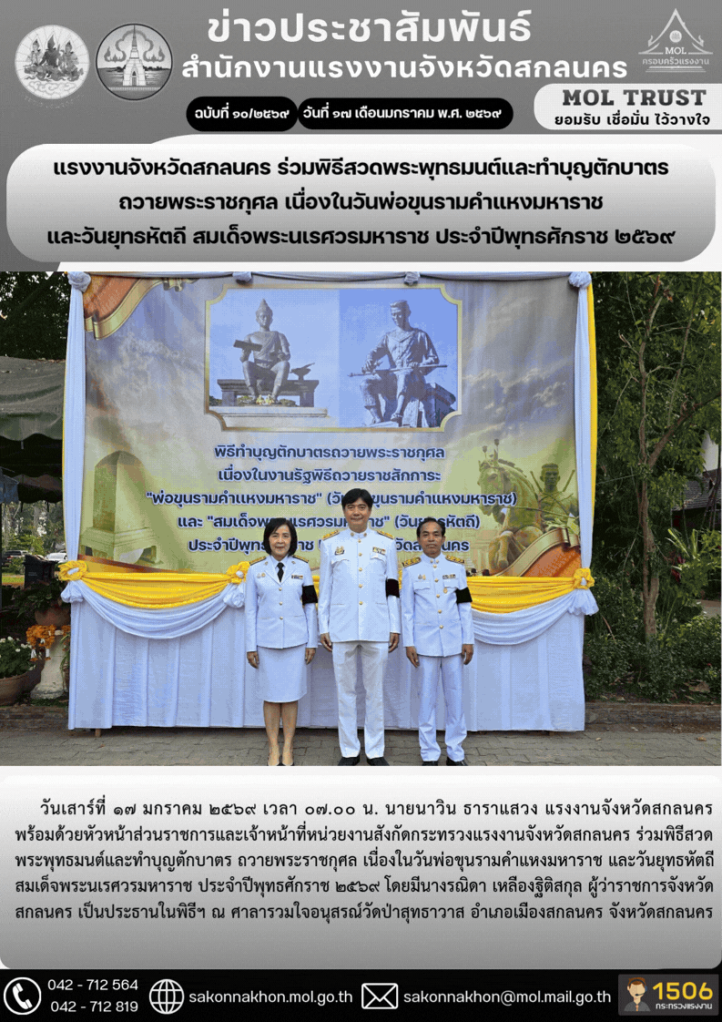 แรงงานจังหวัดสกลนคร ร่วมพิธีสวดพระพุทธมนต์และทำบุญตักบาตร ถวายพระราชกุศล เนื่องในวันพ่อขุนรามคำแหงมหาราช และวันยุทธหัตถี สมเด็จพระนเรศวรมหาราช ประจำปีพุทธศักราช 2569
