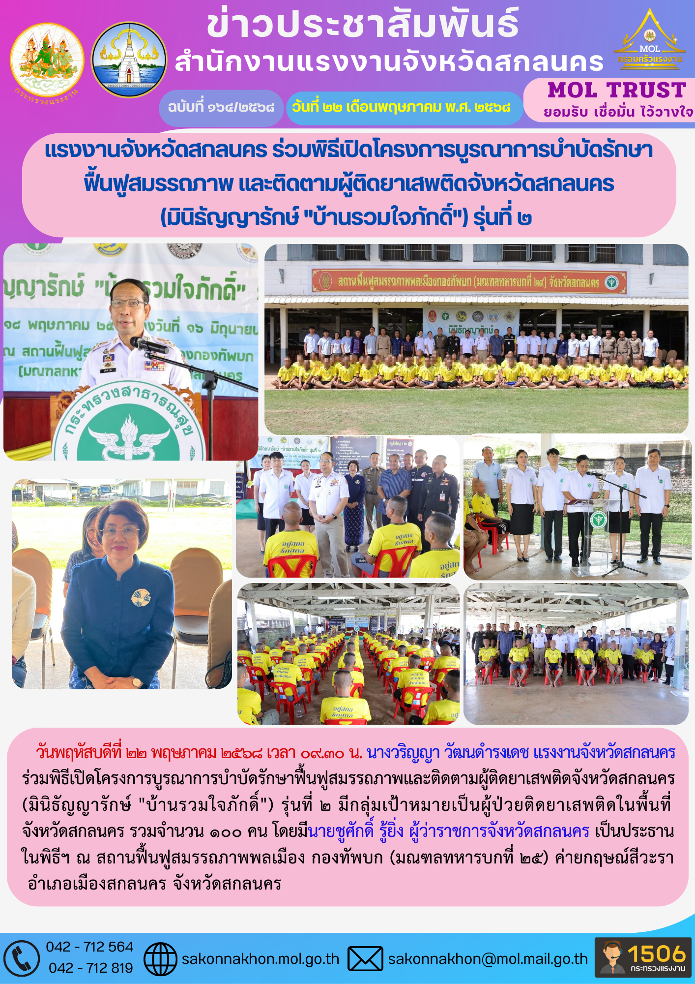 แรงงานจังหวัดสกลนคร ร่วมพิธีเปิดโครงการบูรณาการบำบัดรักษาฟื้นฟูสมรรถภาพ และติดตามผู้ติดยาเสพติดจังหวัดสกลนคร (มินิธัญญารักษ์ “บ้านรวมใจภักดิ์”) รุ่นที่ 2