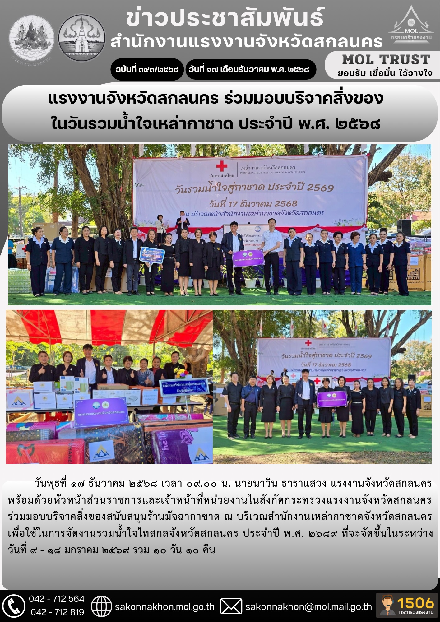 แรงงานจังหวัดสกลนคร ร่วมมอบบริจาคสิ่งของในวันรวมน้ำใจเหล่ากาชาด ประจำปี พ.ศ. 2568
