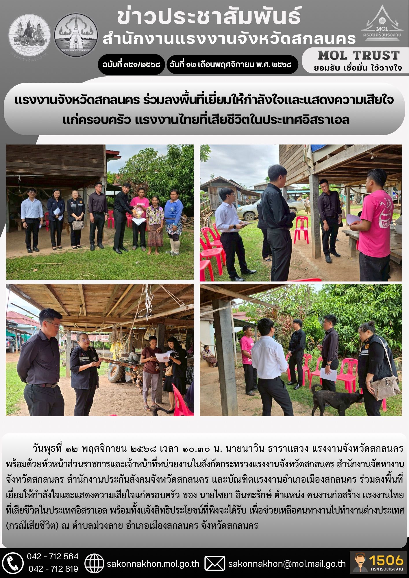แรงงานจังหวัดสกลนคร ร่วมลงพื้นที่เยี่ยมให้กำลังใจและแสดงความเสียใจแก่ครอบครัว แรงงานไทยที่เสียชีวิตในประเทศอิสราเอล