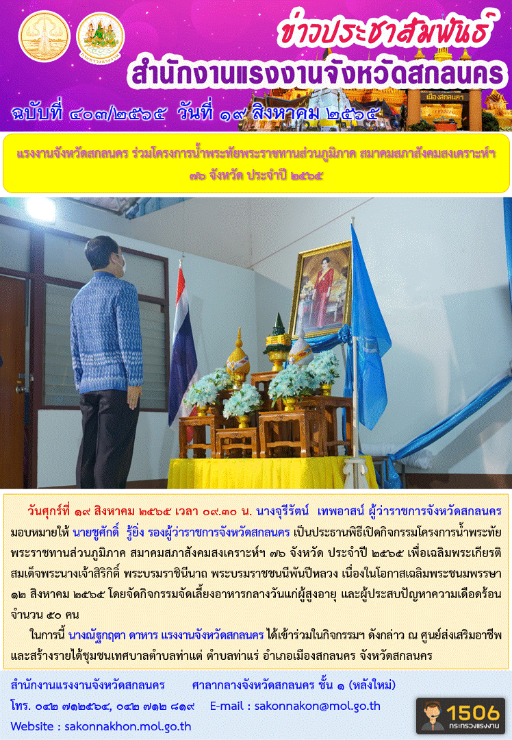 แรงงานจังหวัดสกลนคร ร่วมโครงการน้ำพระทัยพระราชทานส่วนภูมิภาค สมาคมสภาสังคมสงเคราะห์ฯ 76 จังหวัด ประจำปี 2565