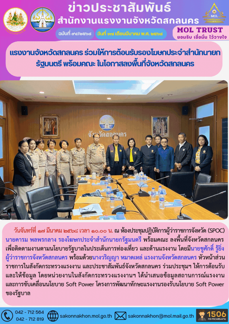 แรงงานจังหวัดสกลนคร ร่วมให้การต้อนรับรองโฆษกประจำสำนักนายกรัฐมนตรี พร้อมคณะ ในโอกาสลงพื้นที่จังหวัดสกลนคร