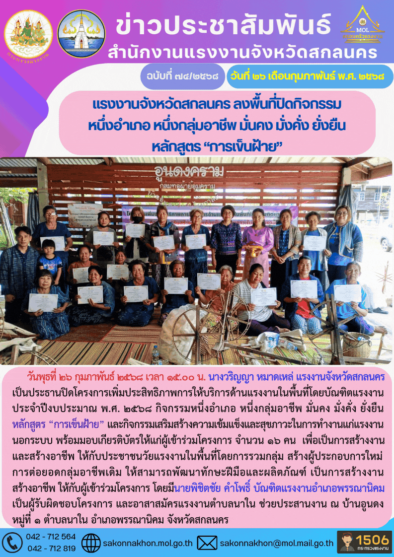 แรงงานจังหวัดสกลนคร ลงพื้นที่ปิดกิจกรรม หนึ่งอำเภอ หนึ่งกลุ่มอาชีพ มั่นคง มั่งคั่ง ยั่งยืน หลักสูตร “การเข็นฝ้าย”