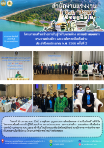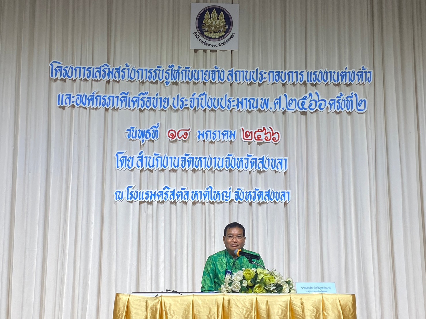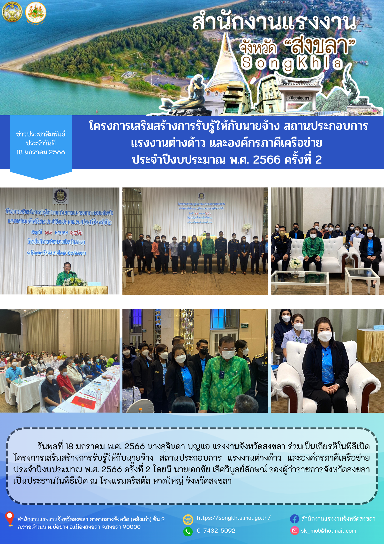 วันพุธที่ 18 มกราคม พ.ศ. 2566 นางสุจินดา บุญแอ แรงงานจังหวัดสงขลา ร่วมเป็นเกียรติในพิธีเปิดโครงการเสริมสร้างการรับรู้ให้กับนายจ้าง สถานประกอบการ แรงงานต่างด้าว และองค์กรภาคีเครือข่าย ประจำปีงบประมาณ พ.ศ. 2566 ครั้งที่ 2 โดยมี นายเอกชัย เลิศวิบูลย์ลักษณ์ รองผู้ว่าราชการจังหวัดสงขลา เป็นประธานในพิธีเปิด ณ โรงแรมคริสตัล หาดใหญ่ จังหวัดสงขลา