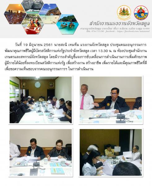 วันที่ 19 มิถุนายน 2561 นายสะนิ เหมหีม แรงงานจังหวัดสตูล ประชุมคณะอนุกรรมการพัฒนาคุณภาพชีวิตผู้มีบัตรสวัสดิการแห่งรัฐประจำจังหวัดสตูล เวลา 13.30 น. ณ ห้องประชุมสำนักงานเกษตรและสหกรณ์จังหวัดสตูล โดยมีวาระสำคัญชี้แจงการขับเคลื่อนการดำเนินงานการเพิ่มศักยภาพผู้มีรายได้น้อยที่ลงทะเบียนสวัสดิการแห่งรัฐ เพื่อสร้างงาน สร้างอาชีพ เพิ่มรายได้และมีคุณภาพชีวิตที่ดี เพื่อขอความเห็นชอบจากคณะอนุกรรมการฯ ในการดำเนินงาน