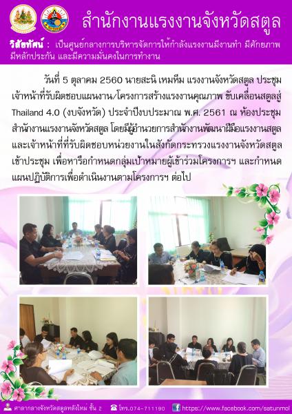 เมื่อวันที่ 5 ตุลาคม 2560 นายสะนิ เหมหีม แรงงานจังหวัดสตูล ประชุมเจ้าหน้าที่รับผิดชอบแผนงาน/โครงการสร้างแรงงานคุณภาพ ขับเคลื่อนสตูลสู่Thailand 4.0 (งบจังหวัด) ประจำปีงบประมาณ พ.ศ. 2561 ณ ห้องประชุมสำนักงานแรงงานจังหวัดสตูล
