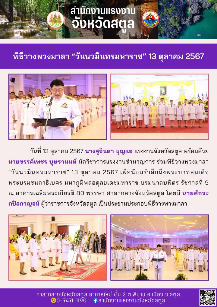 วันที่ 13 ตุลาคม 2567 นางสุจินดา บุญแอ แรงงานจังหวัดสตูล พร้อมด้วย นายขรรค์เพชร บุษรานนท์ นักวิชาการแรงงานชำนาญการ ร่วมพิธีวางพวงมาลา “วันนวมินทรมหาราช” 13 ตุลาคม 2567 เพื่อน้อมรำลึกถึงพระบาทสมเด็จพระบรมชนกาธิเบศร มหาภูมิพลอดุลยเดชมหาราช บรมนาถบพิตร รัชกาลที่ 9 ณ อาคารเฉลิมพระเกียรติ 80 พรรษา ศาลากลางจังหวัดสตูล โดยมี นายศักระ กปิลกาญจน์ ผู้ว่าราชการจังหวัดสตูล เป็นประธานประกอบพิธีวางพวงมาลา