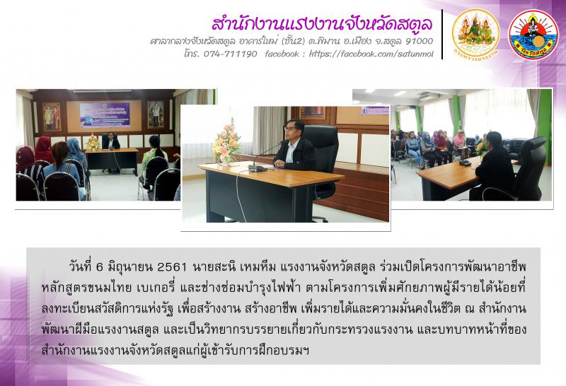 วันที่ 6 มิถุนายน 2561 นายสะนิ เหมหีม แรงงานจังหวัดสตูล ร่วมเปิดโครงการพัฒนาอาชีพ หลักสูตรขนมไทย เบเกอรี่ และช่างซ่อมบำรุงไฟฟ้า ตามโครงการเพิ่มศักยภาพผู้มีรายได้น้อยที่ลงทะเบียนสวัสดิการแห่งรัฐ เพื่อสร้างงาน สร้างอาชีพ เพิ่มรายได้และความมั่นคงในชีวิต ณ สำนักงานพัฒนาฝีมือแรงงานสตูล และเป็นวิทยากรบรรยายเกี่ยวกับกระทรวงแรงงาน และบทบาทหน้าที่ของสำนักงานแรงงานจังหวัดสตูลแก่ผู้เข้ารับการฝึกอบรมฯ