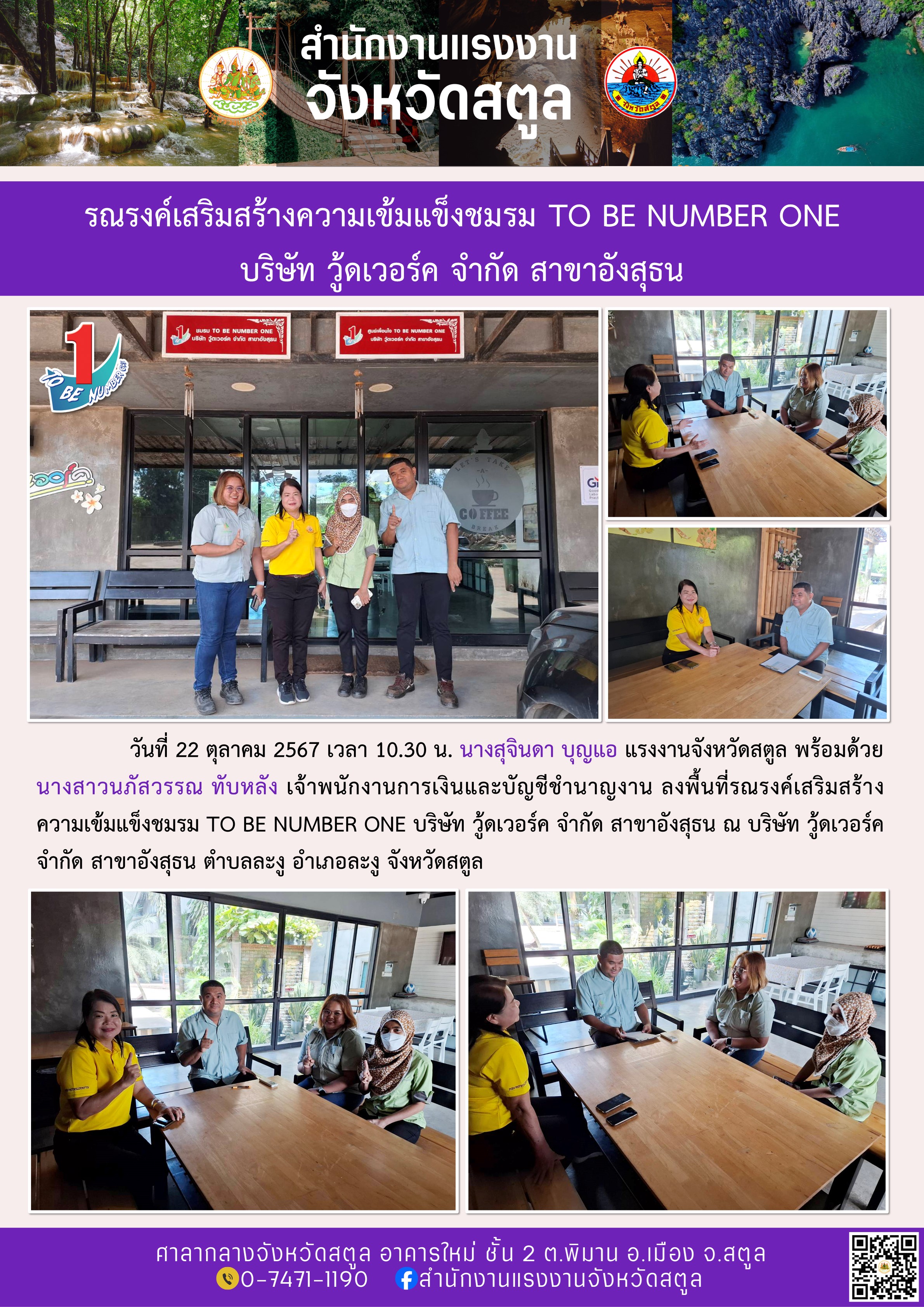 วันที่ 22 ตุลาคม 2567 เวลา 10.30 น. นางสุจินดา บุญแอ แรงงานจังหวัดสตูล พร้อมด้วย นางสาวนภัสวรรณ ทับหลัง เจ้าพนักงานการเงินและบัญชีชำนาญงาน ลงพื้นที่รณรงค์เสริมสร้างความเข้มแข็งชมรม TO BE NUMBER ONE บริษัท วู้ดเวอร์ค จำกัด สาขาอังสุธน ณ บริษัท วู้ดเวอร์ค จำกัด สาขาอังสุธน ตำบลละงู อำเภอละงู จังหวัดสตูล