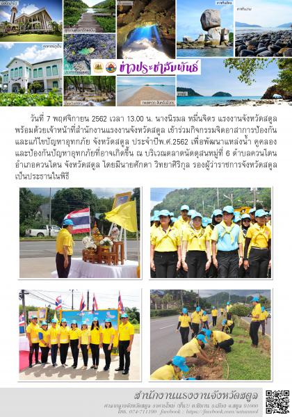 เมื่อวันที่ 7 พฤศจิกายน 2562 เวลา 13.00 น. นางนิรมล หมื่นจิตร แรงงานจังหวัดสตูล พร้อมด้วยเจ้าหน้าที่สำนักงานแรงงานจังหวัดสตูล เข้าร่วมกิจกรรมจิตอาสาการป้องกันและแก้ไขปัญหาอุทกภัย จังหวัดสตูล ประจำปีพ.ศ.2562 เพื่อพัฒนาแหล่งน้ำ คูคลองและป้องกันปัญหาอุทกภัยที่อาจเกิดขึ้น ณ บริเวณตลาดนัดดุสนหมู่ที่ 6 ตำบลควนโดน อำเภอควนโดน จังหวัดสตูล โดยมีนายศักดา วิทยาศิริกุล รองผู้ว่าราชการจังหวัดสตูล เป็นประธานในพิธี